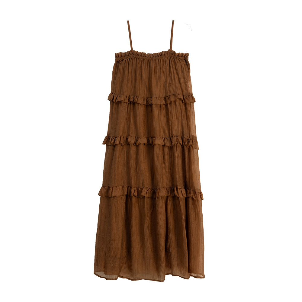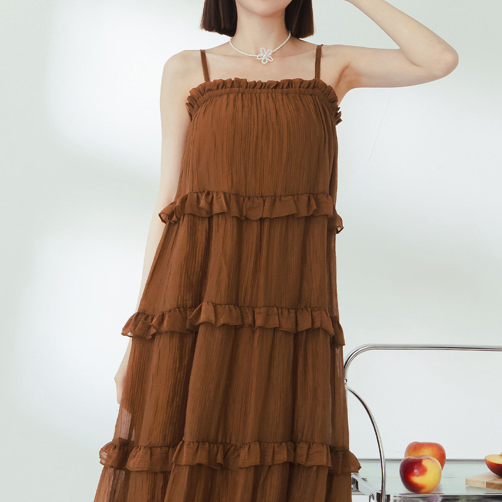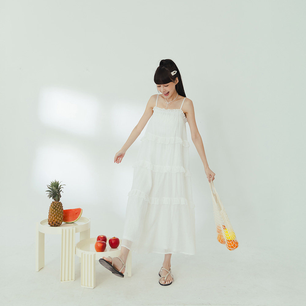 QUEENSHOP 2025春夏新品女装荷叶细褶蛋糕细肩长连衣裙01087097