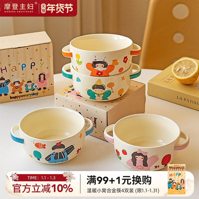 摩登主妇一家三口双耳蒸蛋碗家用陶瓷碗具儿童饭碗宝宝辅食碗汤碗