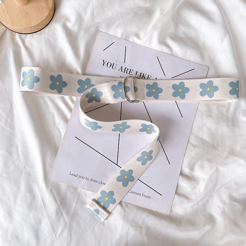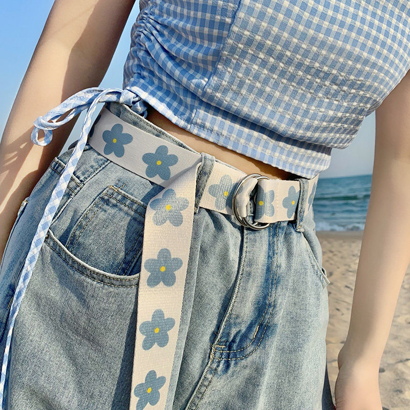 小花帆布腰带女生秋季小皮带免打孔牛仔裤百搭女士装饰裤带双环扣