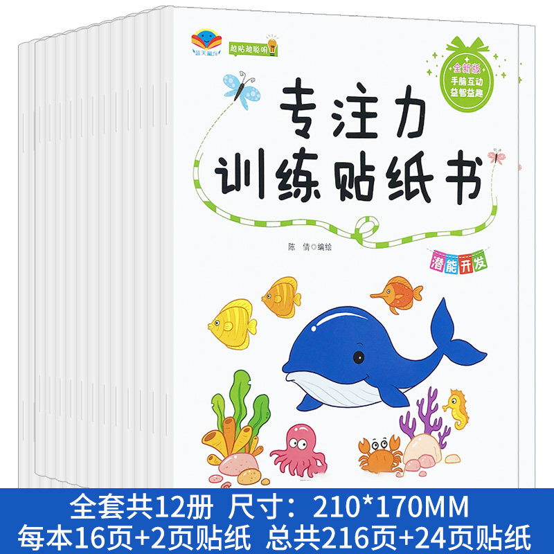 全12册儿童专注力贴纸书宝宝卡通贴贴画2-3-4-6岁5幼儿园益智玩具贴贴纸左右脑全脑开发趣味黏贴玩具奖励粘贴