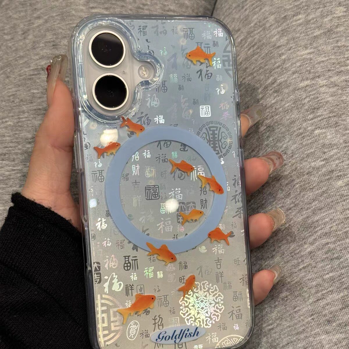 中式百福图金鱼摇摇乐磁吸支架适用iPhone15promax苹果14手机壳13pro防摔1211个性16promax创意xs/xr女78plus