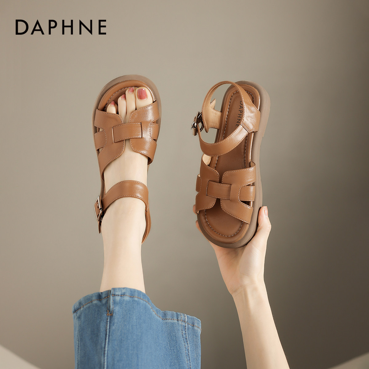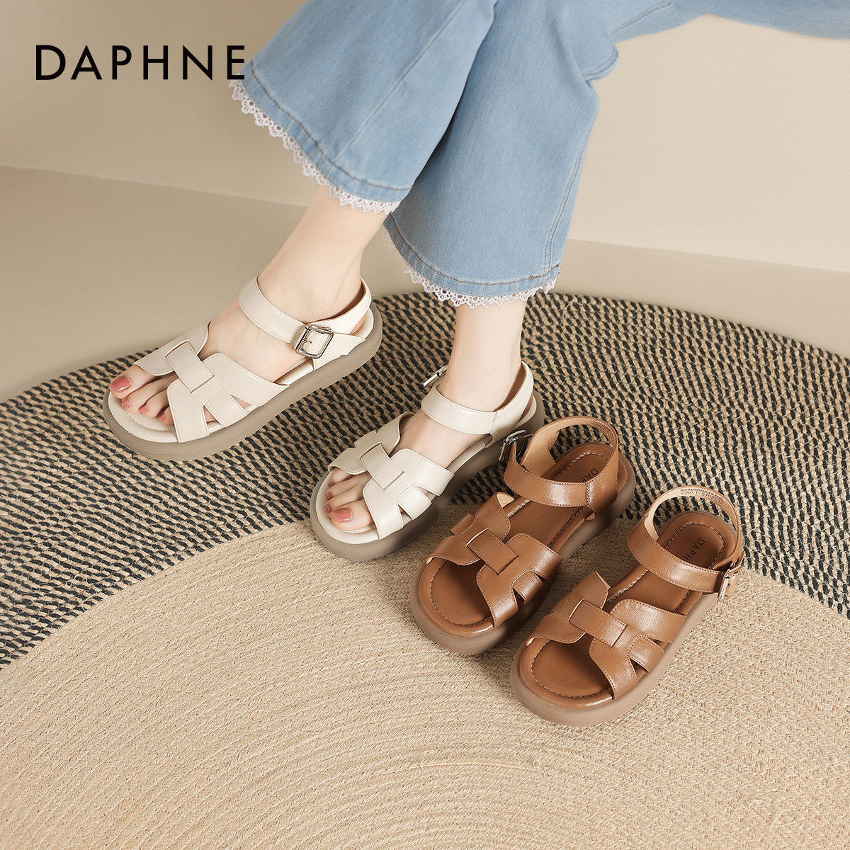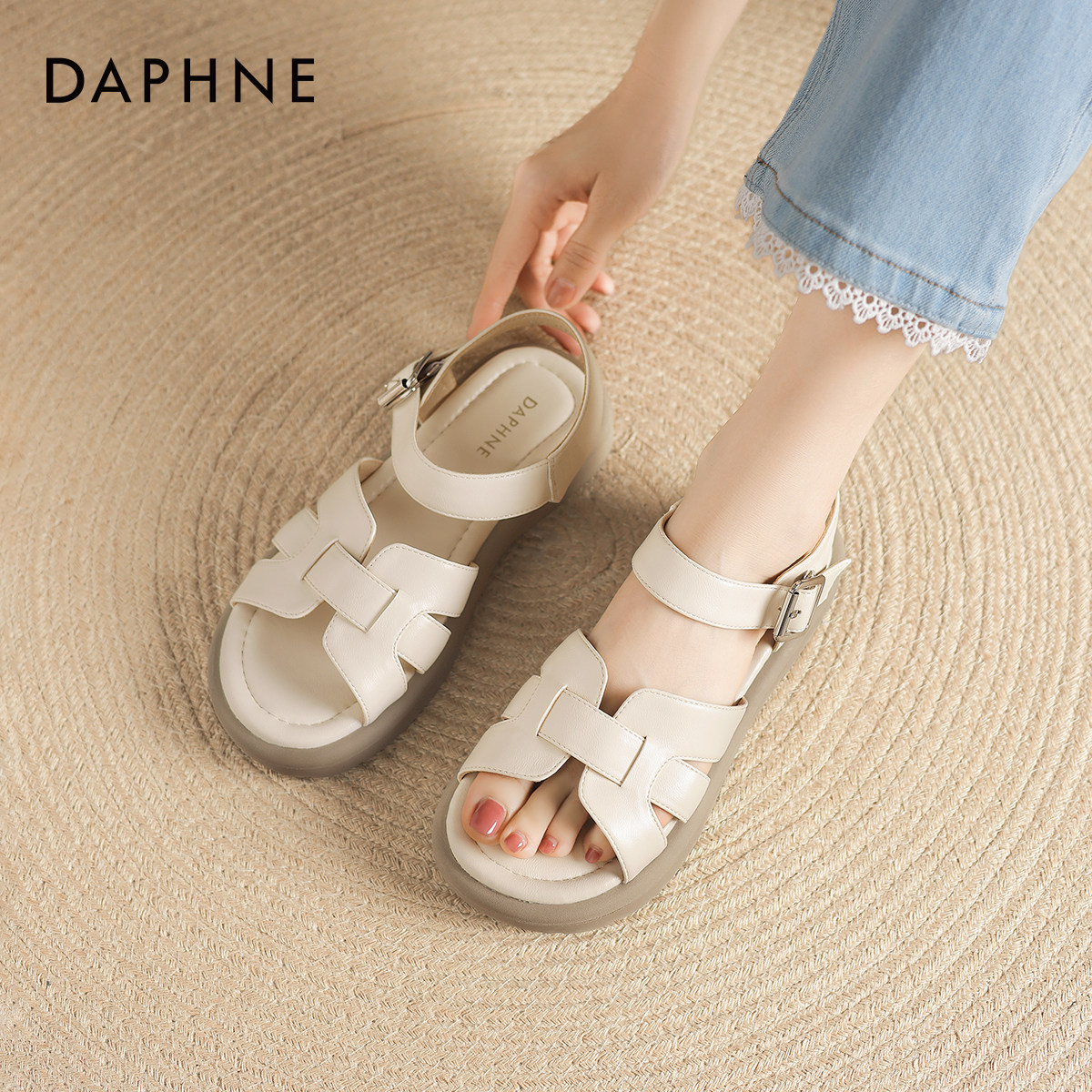 达芙妮平底凉鞋女2026新款夏季女鞋露趾猪笼鞋法式罗马编织沙滩鞋