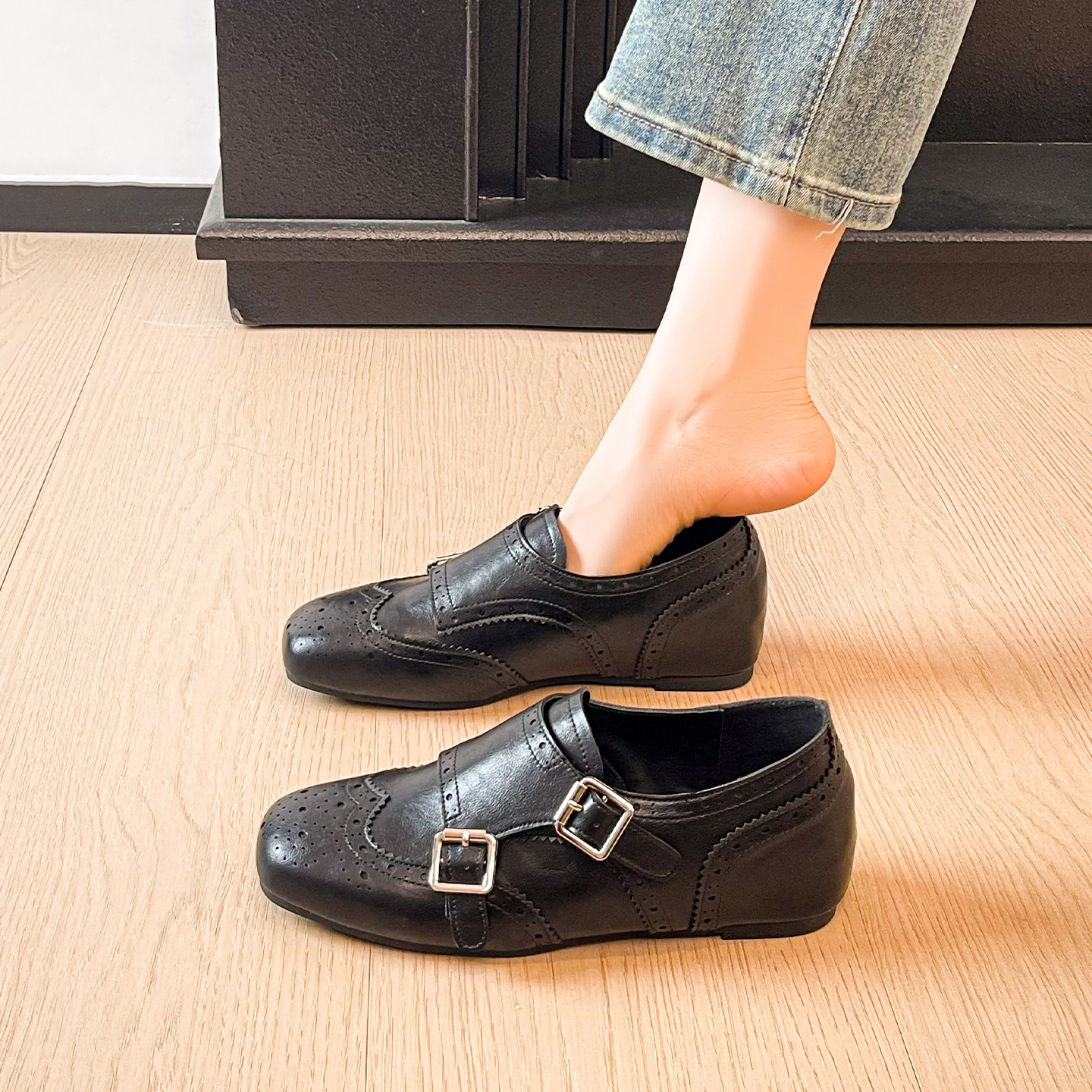 羊皮版~复古雕花乐福鞋女平底不累脚通勤单鞋英伦小皮鞋大码女鞋
