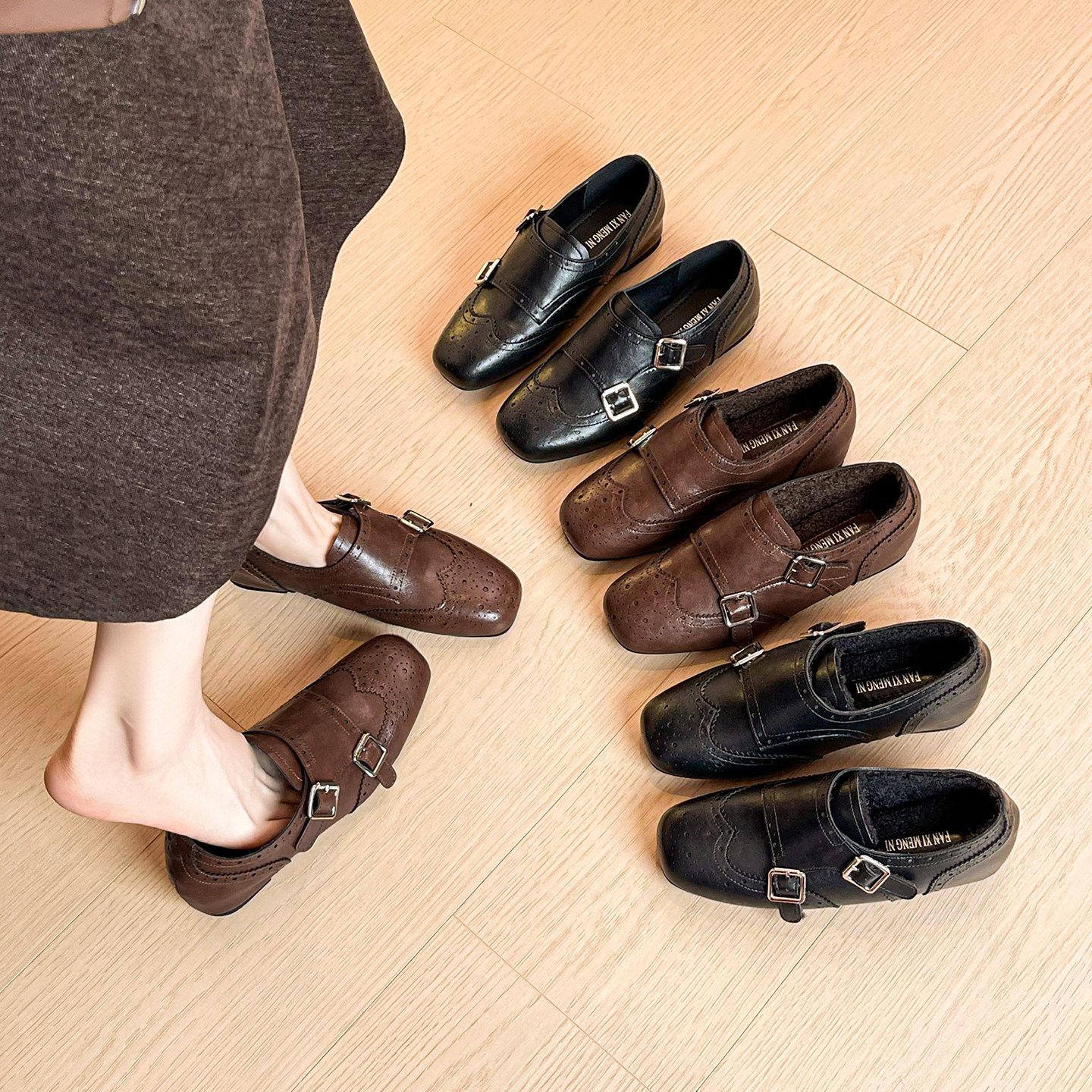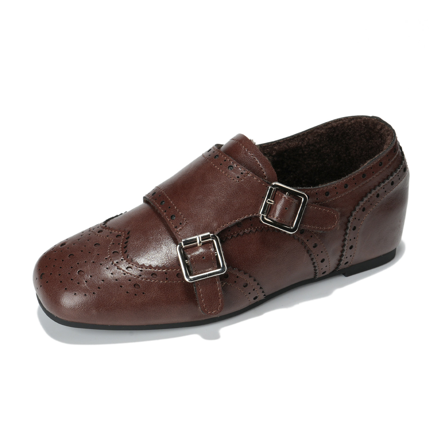 真皮版~内增高棕色乐福鞋女冬加绒单鞋布洛克雕花小皮鞋大码女鞋