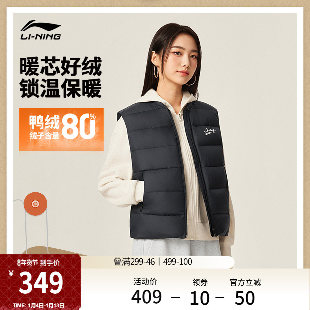 李宁羽绒马甲女士官方新款运动生活系列休闲冬季鸭绒运动服