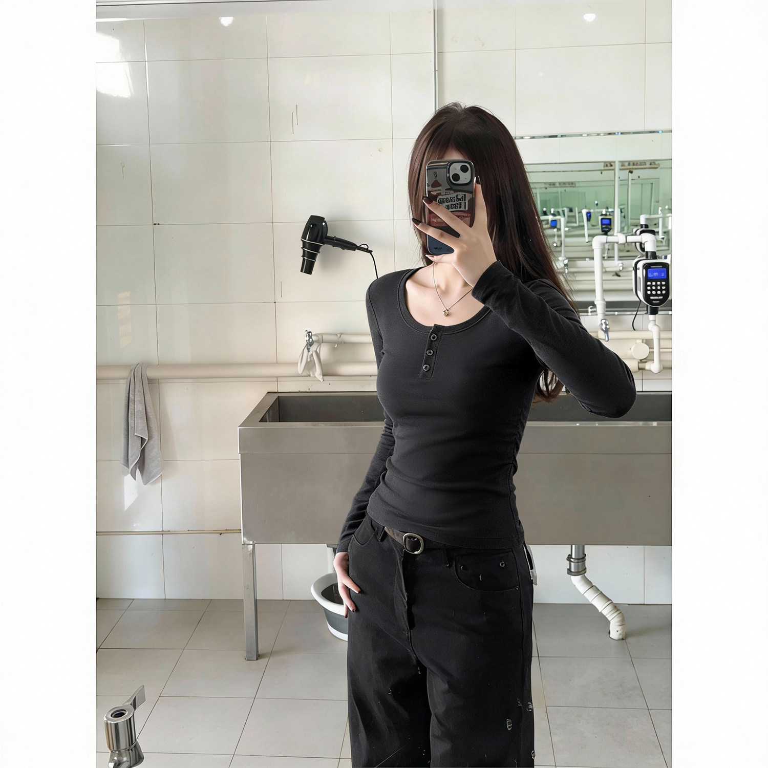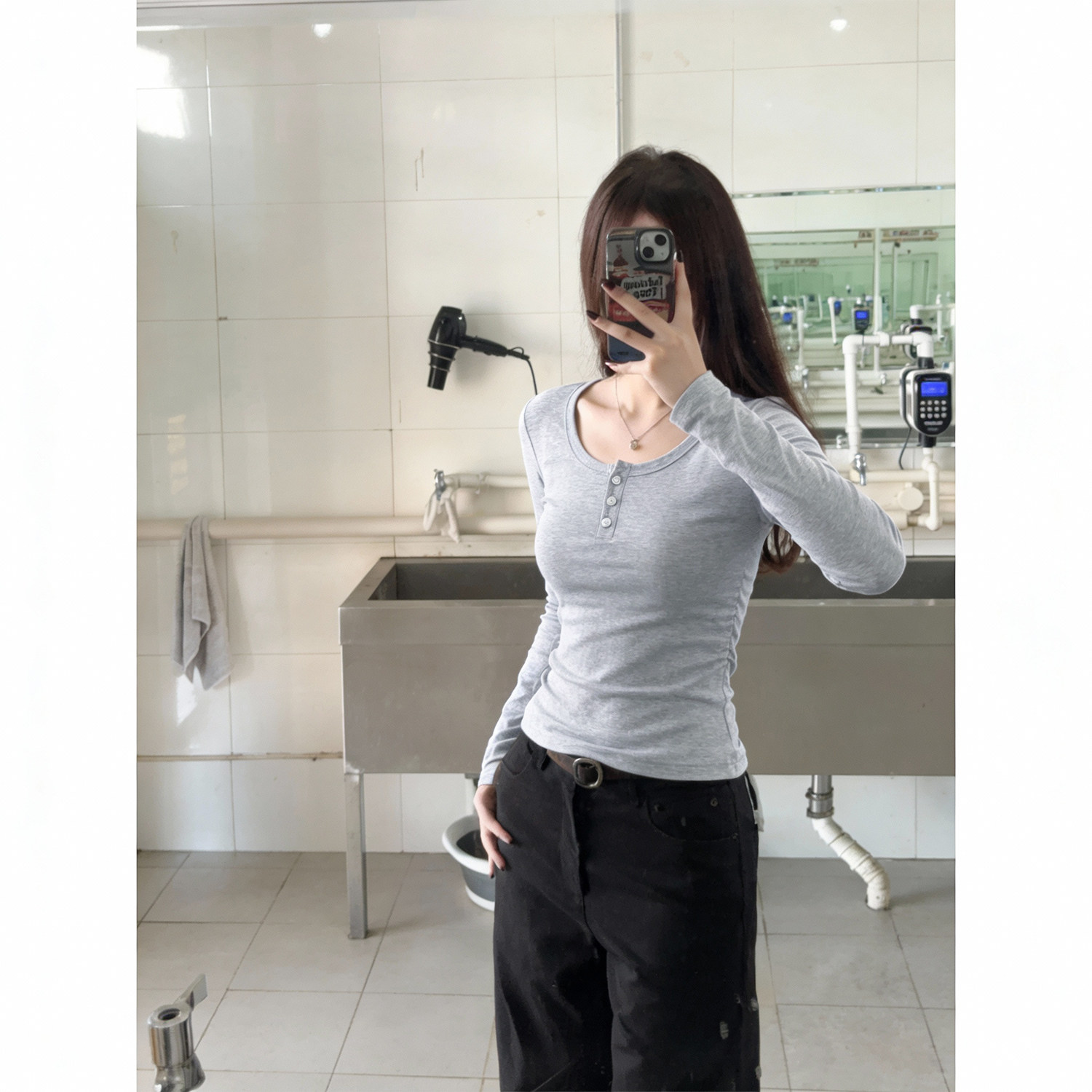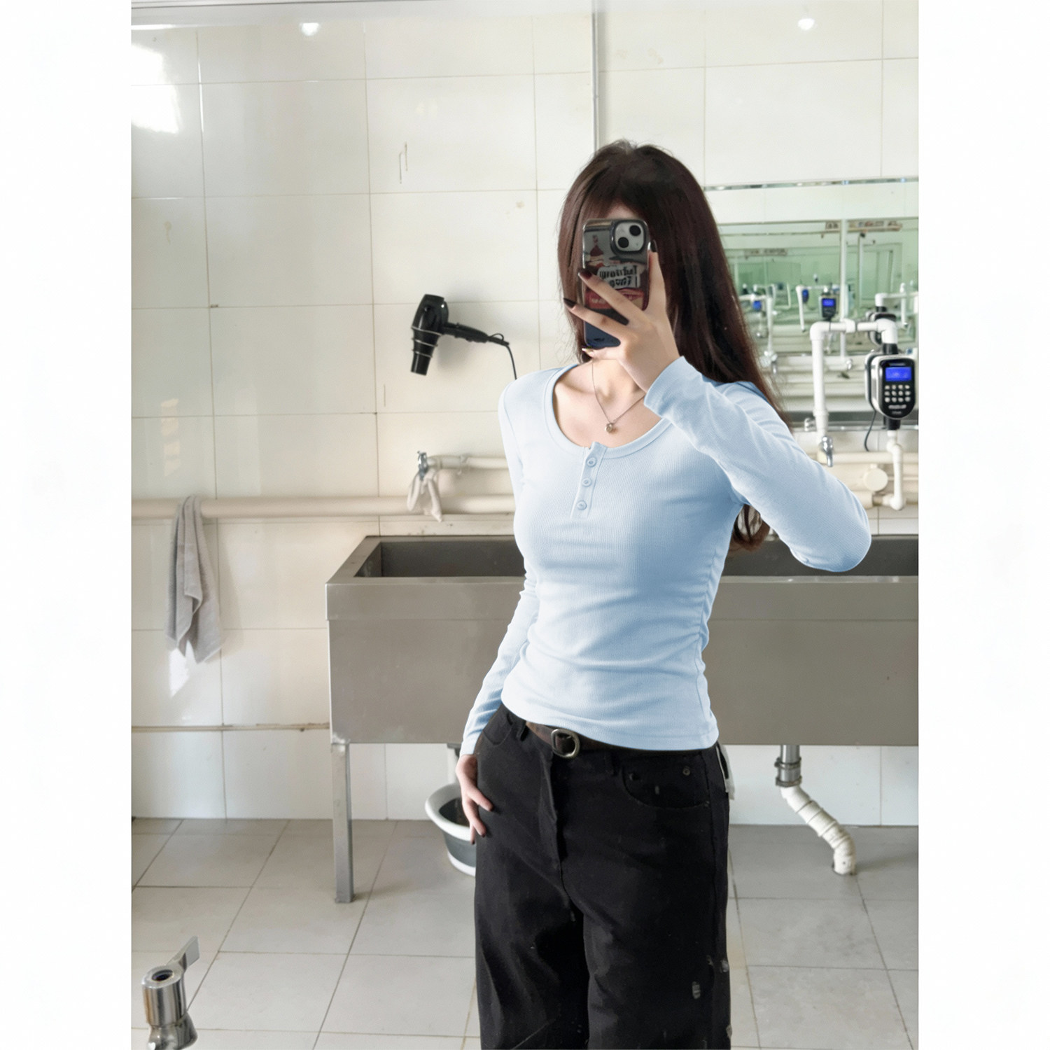 NOW真维斯白色长袖t恤女新款2026春秋修身u领开扣内搭打底衫上衣