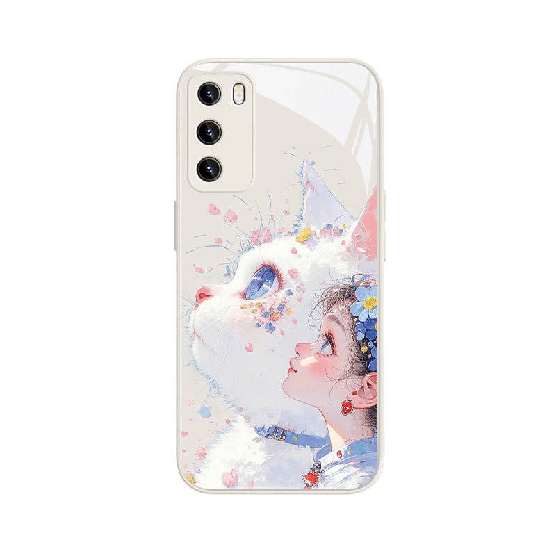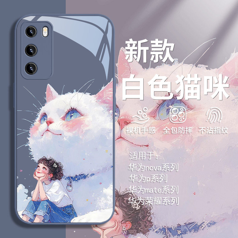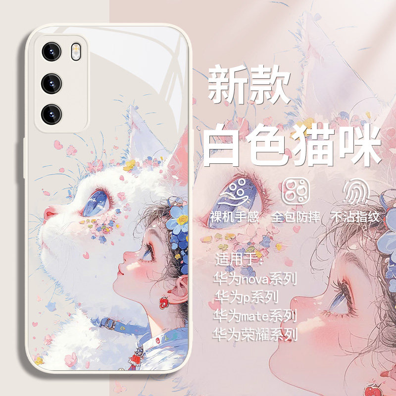 适用华为mate60pro手机壳动漫女孩pura70白色猫咪荣耀200甜美风nova12小清新11治愈系p60新款p50/p40玻璃90gt