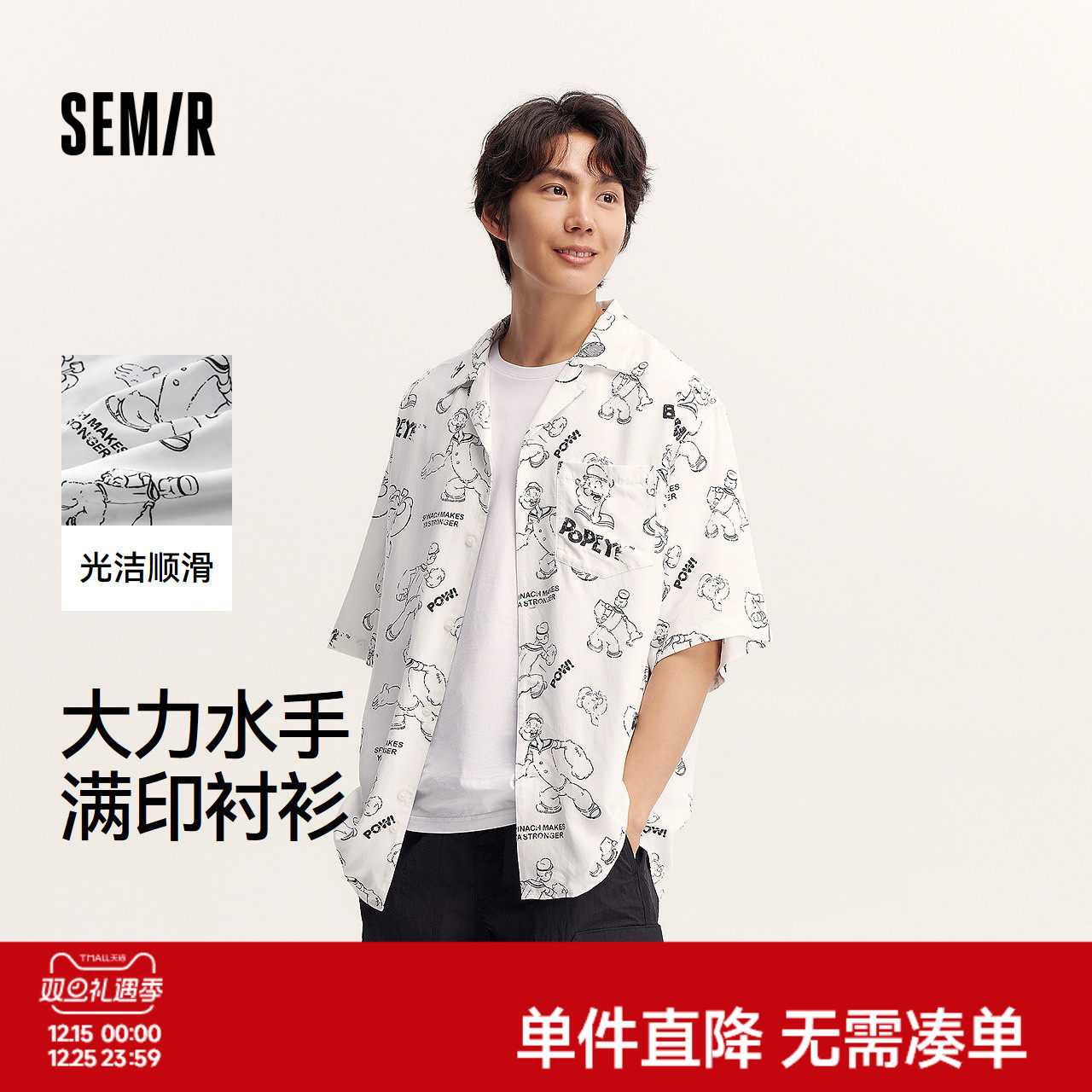 森马大力水手联名短袖衬衫男时髦印花沙滩衬衣夏季度假上衣小宽松