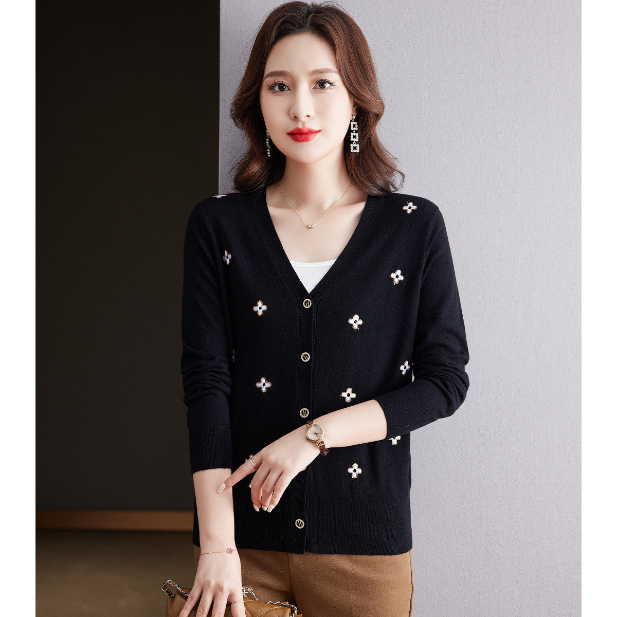 2026秋冬女式针织衫V领时尚简约休闲优雅气质长袖毛衫上衣女