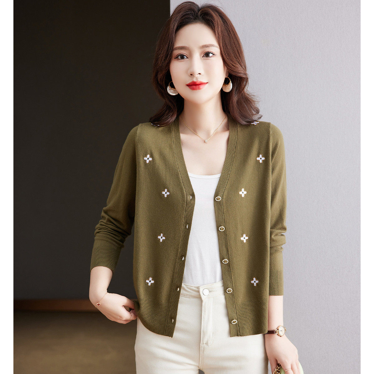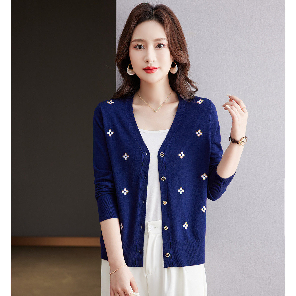 反季清仓春秋新款V领羊绒开衫女外搭纯色大码毛衣打底针织衫外搭