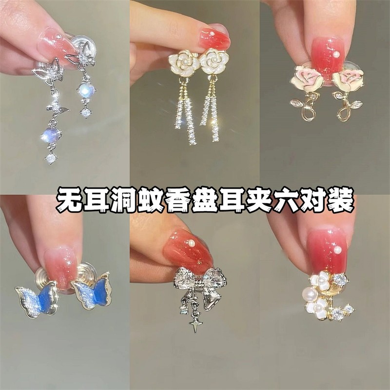 没有耳洞也能戴蝴蝶耳夹六对装蚊香盘无耳洞耳饰小众花朵女不对称