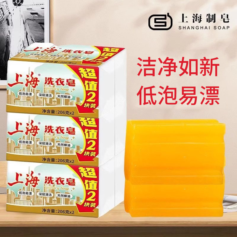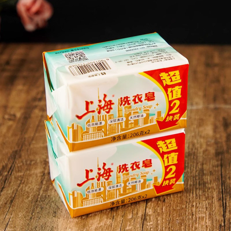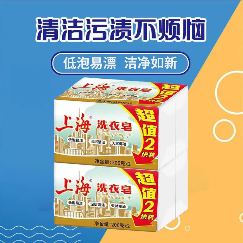 上海洗衣皂206g*2块低泡易漂深层清洁国货家用洗衣肥皂去污椰油