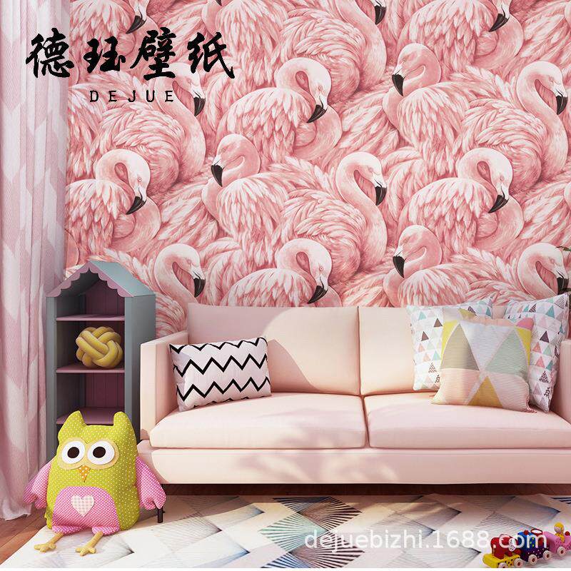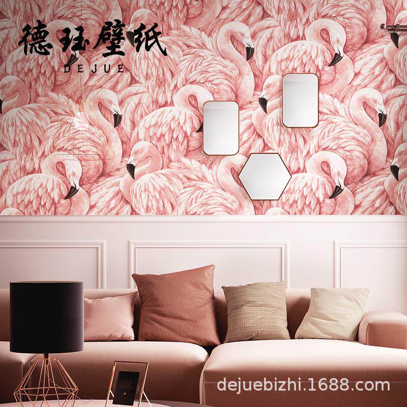 北欧粉色无纺布火烈鸟墙纸卧室房间客厅网红电视背景墙壁纸高级感