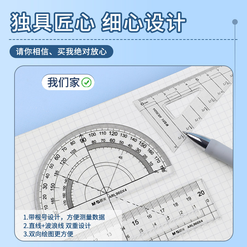 晨光根号套尺小学生专用四件套三角尺直尺格尺量角器儿童测量绘图透明15cm波浪线尺子圆规几何工具文具套装