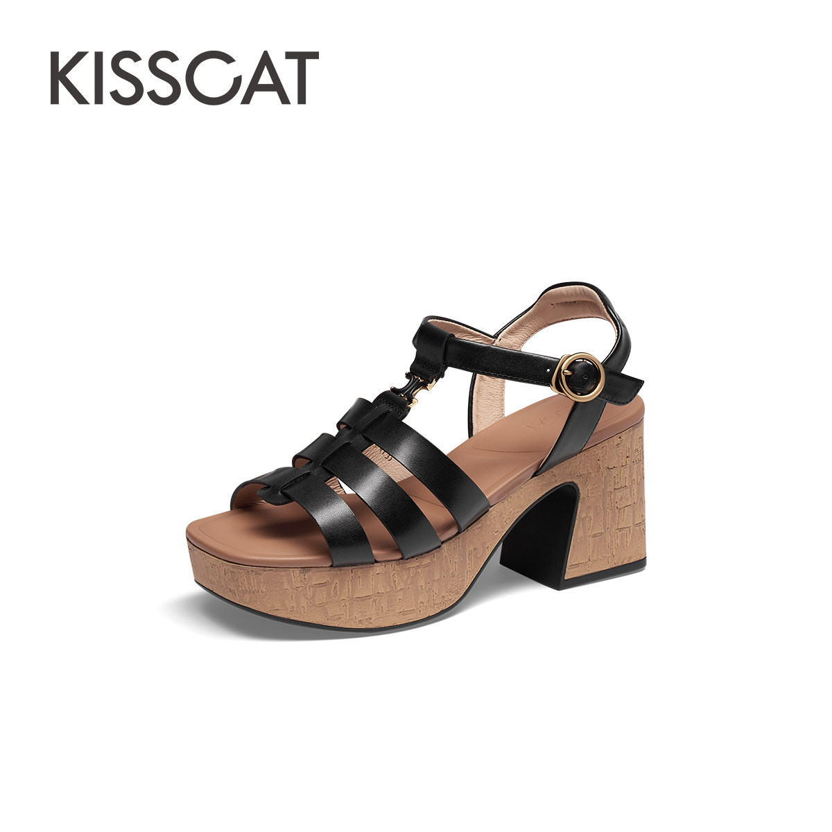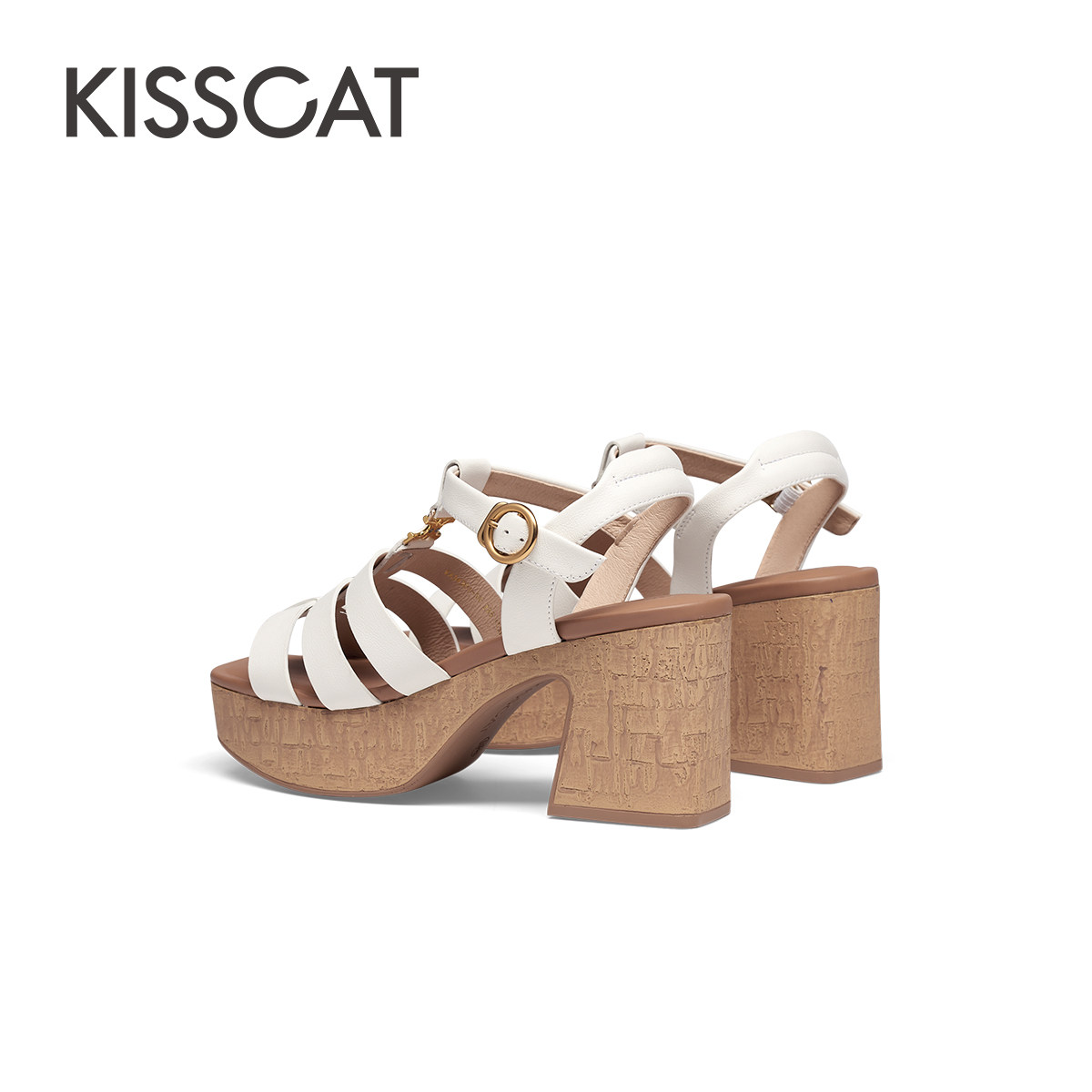 KISSCAT接吻猫[复古芭比]夏季高跟凉鞋厚底防水台坡跟罗马凉鞋