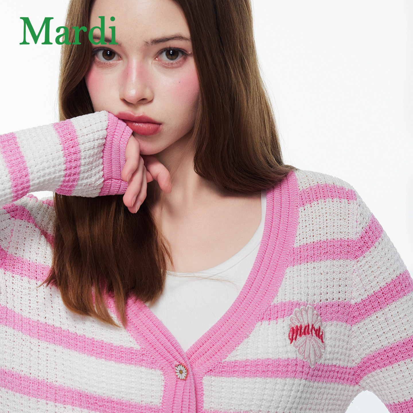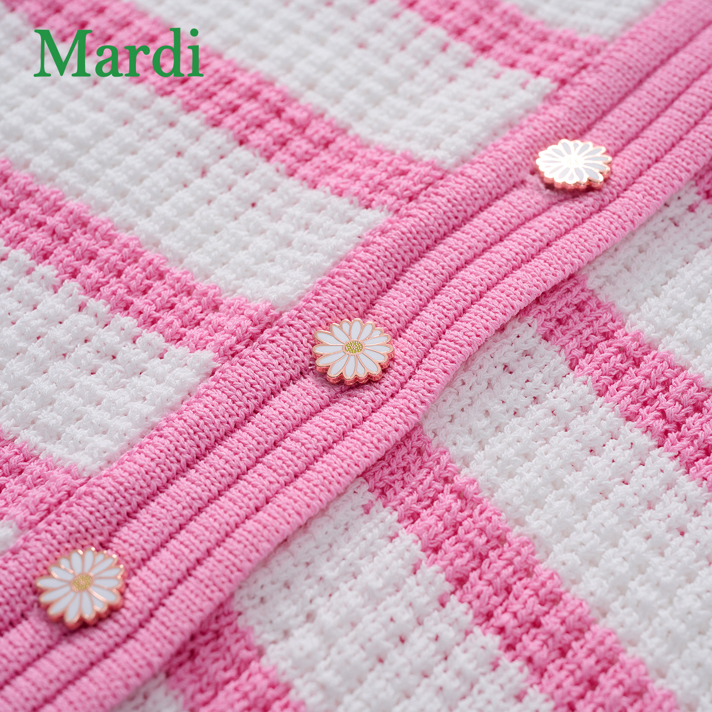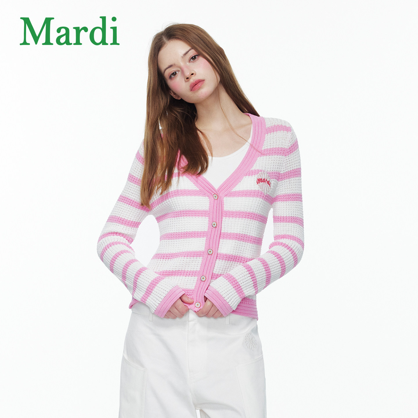 MARDI撞色条纹针织开衫26新款女V领单排扣温柔慵懒风毛衣粉色