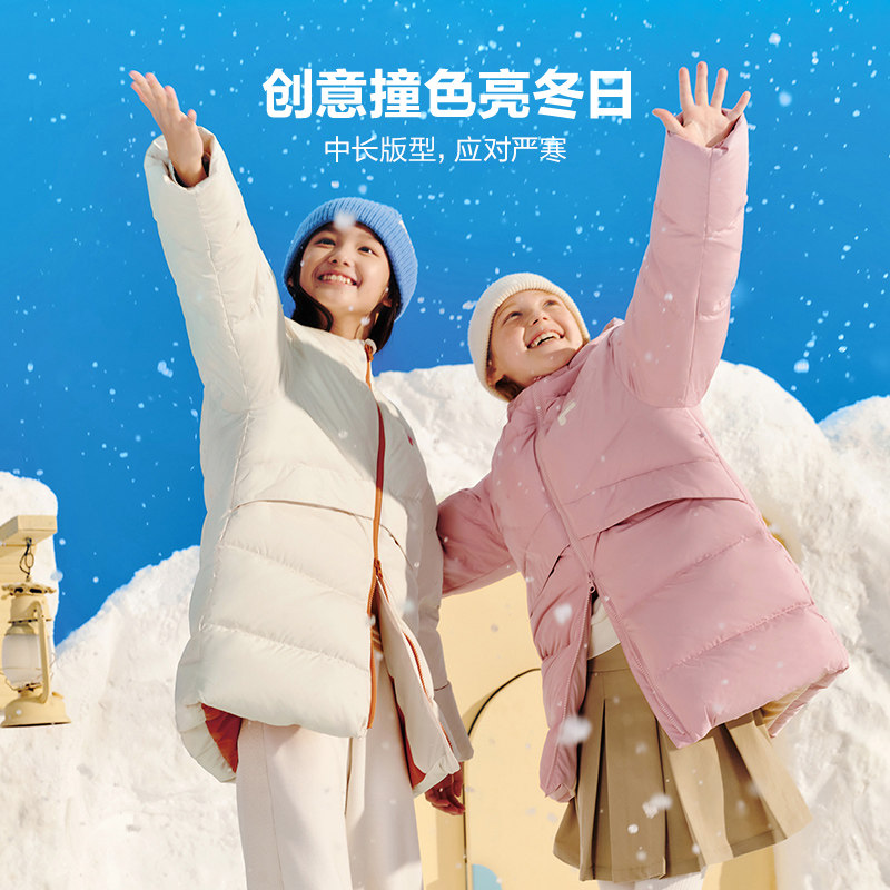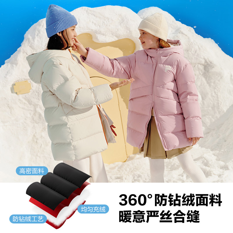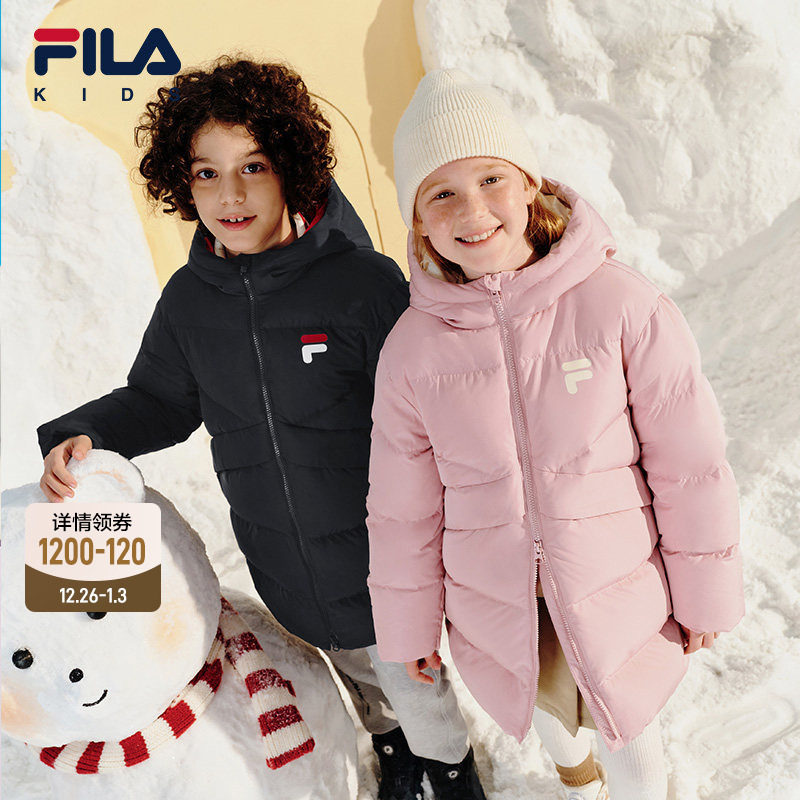 FILA斐乐儿童多彩中长羽绒服2025冬新款女童外套连帽宝宝保暖上衣