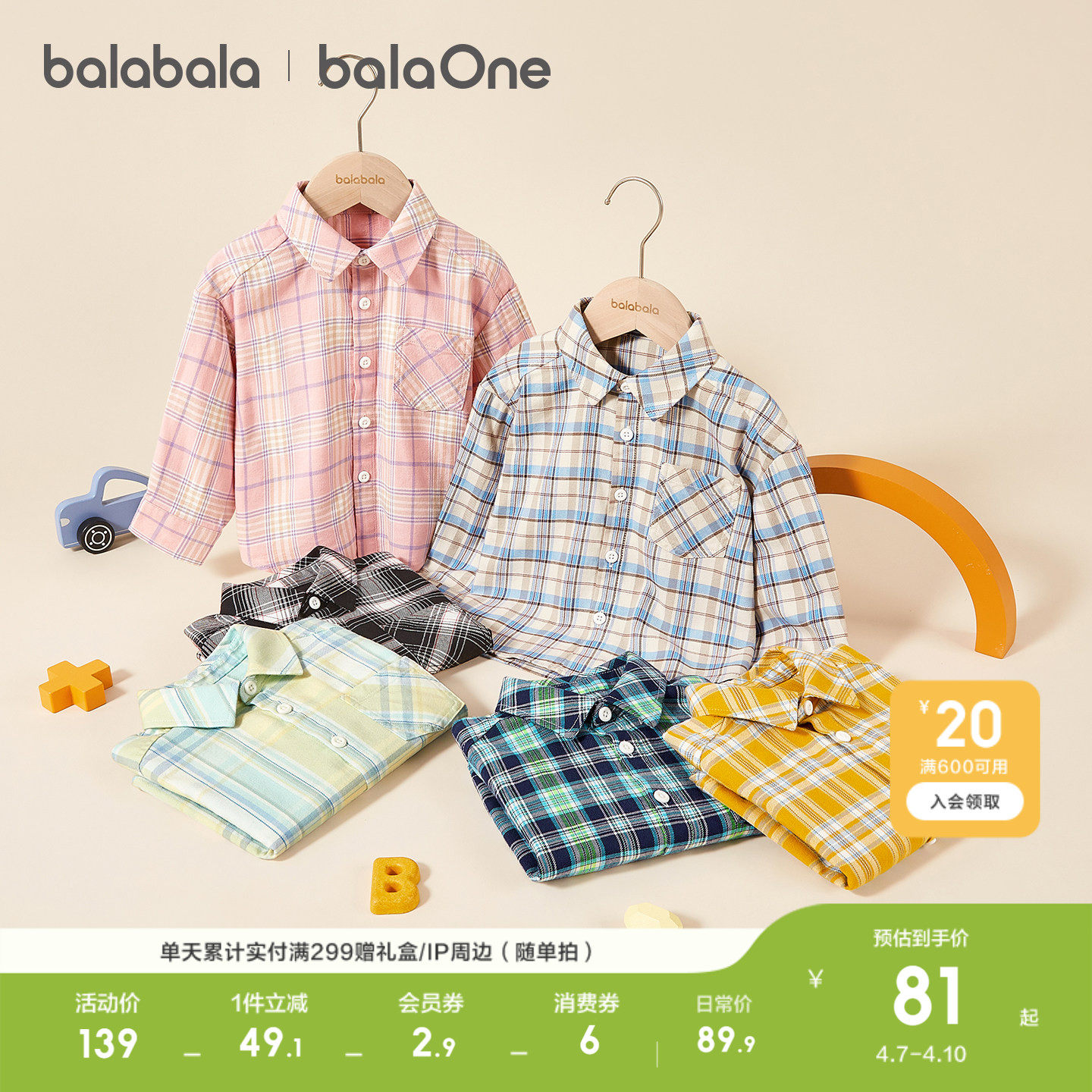 巴拉巴拉童装儿童衬衫长袖男女童2026新款春装宝宝超柔绒格子衬衣
