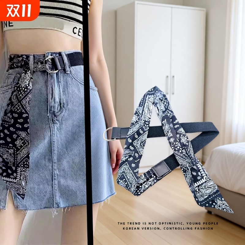 帆布拼丝巾腰带女士配连衣裙子时尚百搭装饰牛仔裤带个性皮带女款