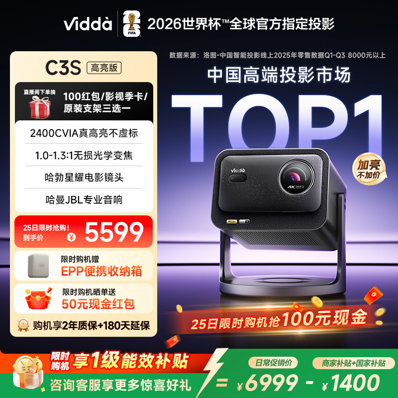 【新品升级!政府补贴】Vidda C3S高亮版2400CVIA海信4K超高清三色激光投影仪变焦家用卧室电视手机家庭影院