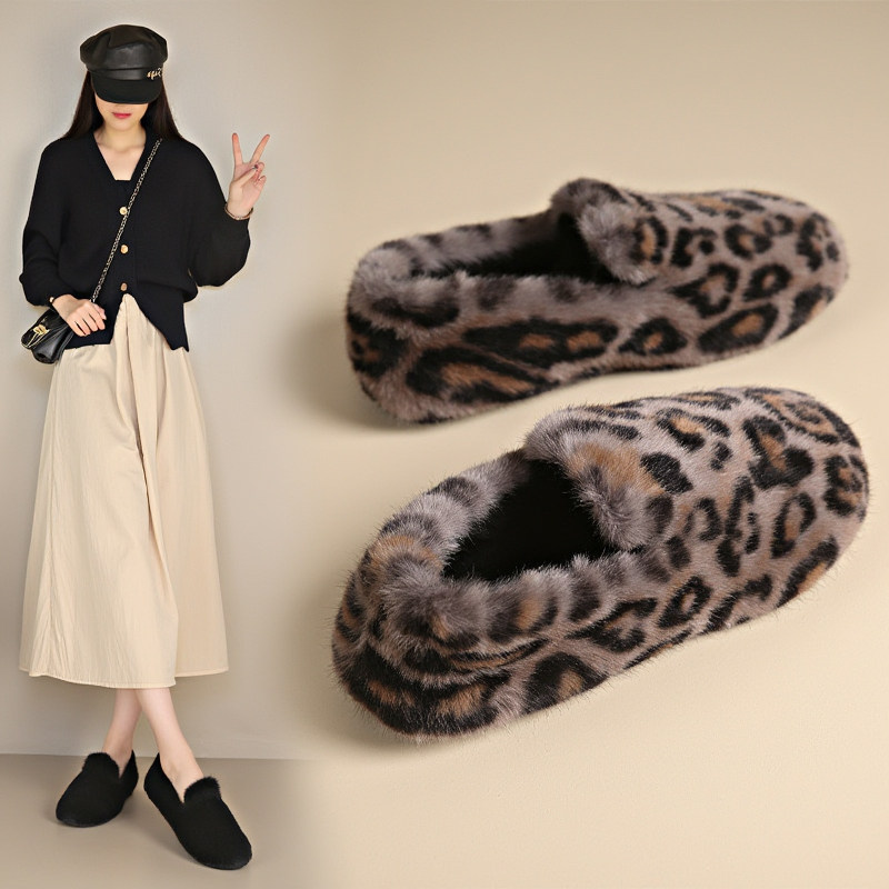 【水貂绒】豹纹毛毛鞋女冬季外穿高级感加绒保暖一脚蹬软底豆豆鞋