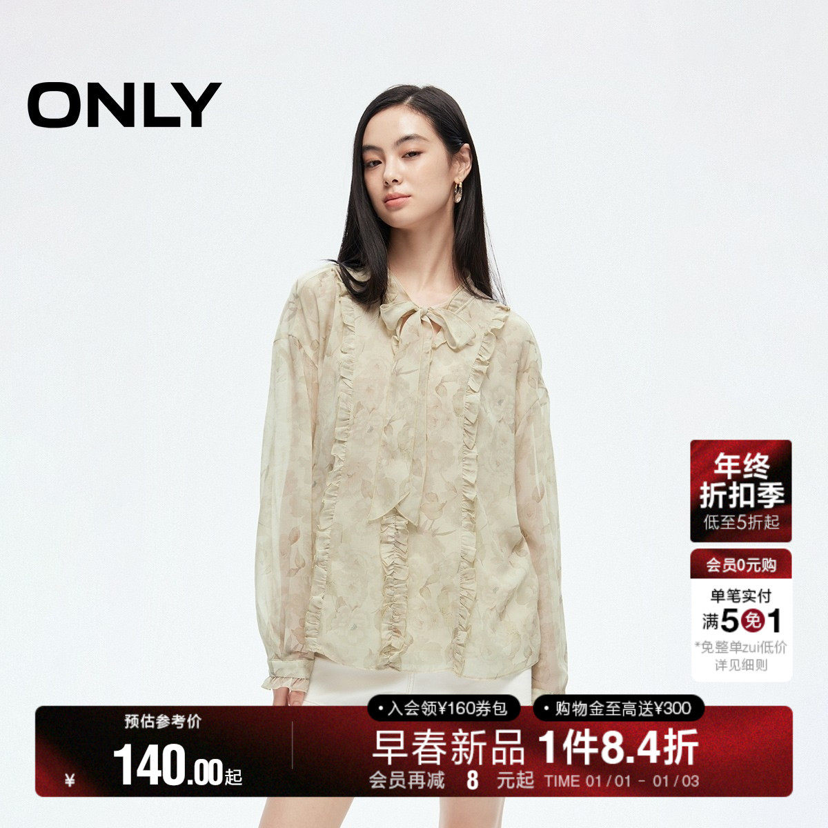 ONLY夏季通勤遮肚子时尚宽松V领系带雪纺衫女|124351002
