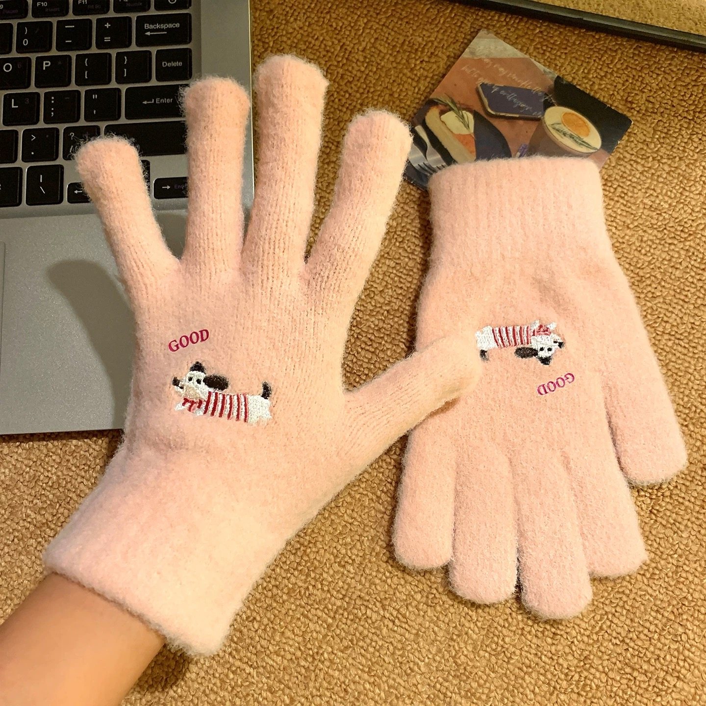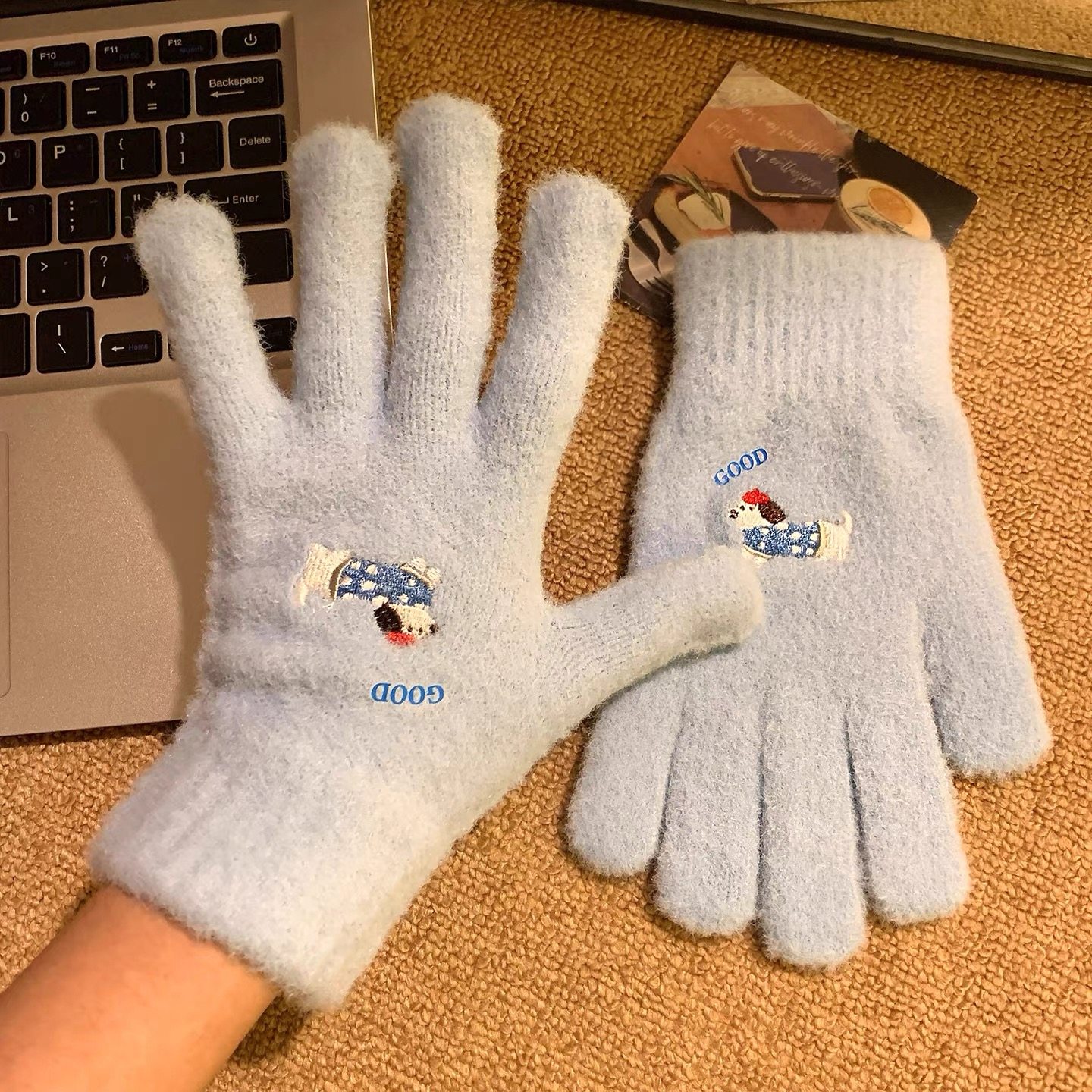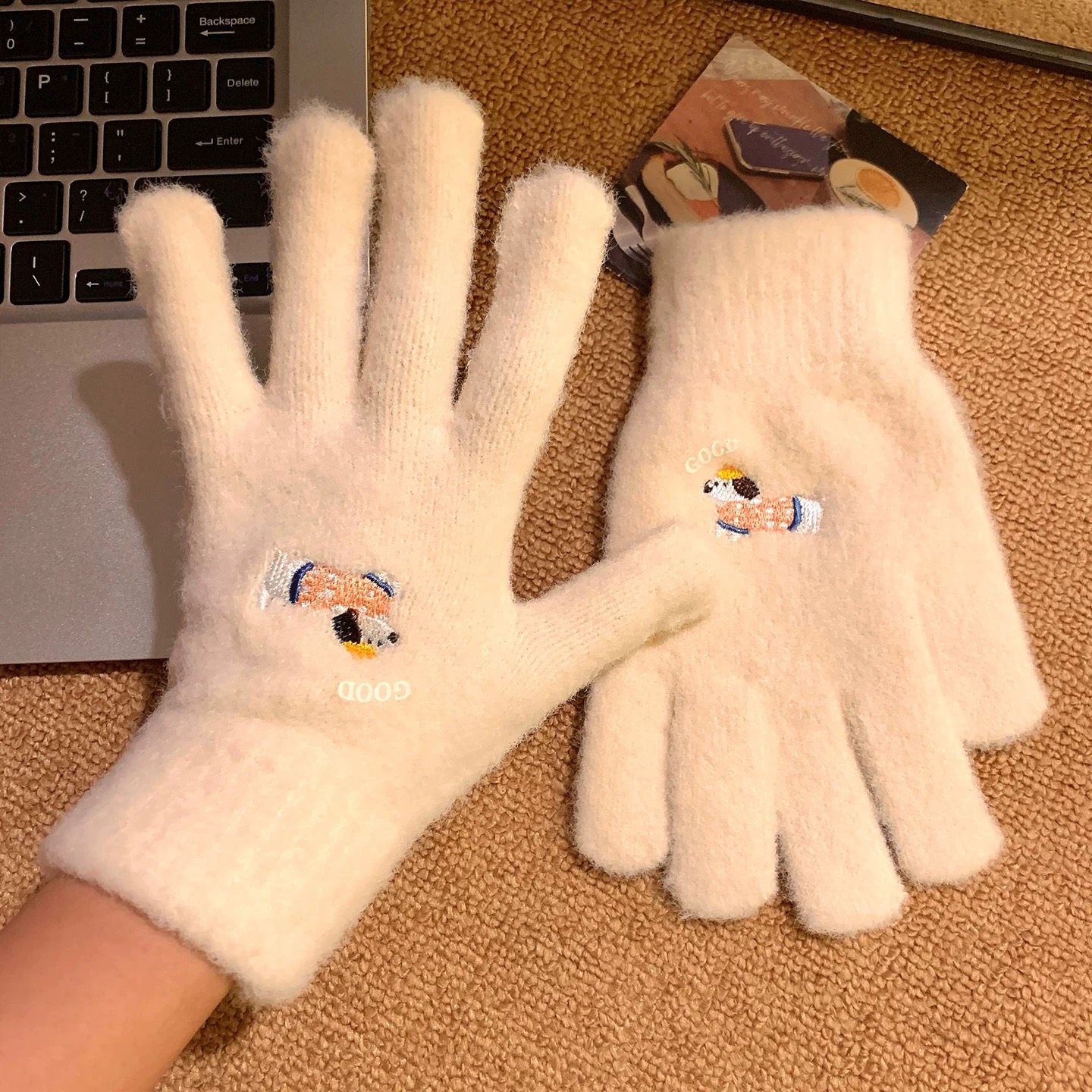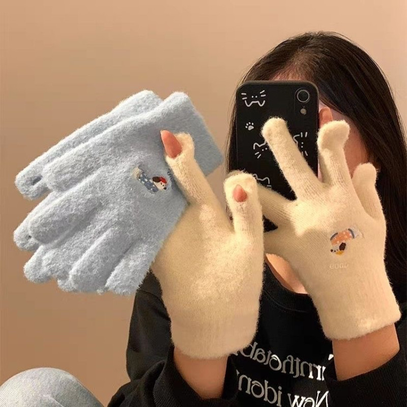 可爱卡通刺绣毛绒手套女冬季保暖加厚分指骑车时尚百搭可触屏白色