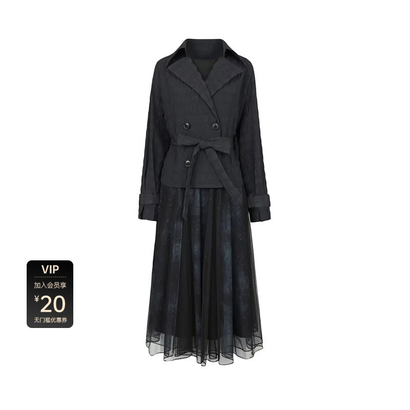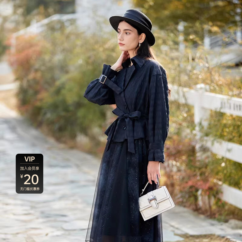 sdeer圣迪奥女装秋优雅肌理收腰网纱晕染连衣裙套装S24161404
