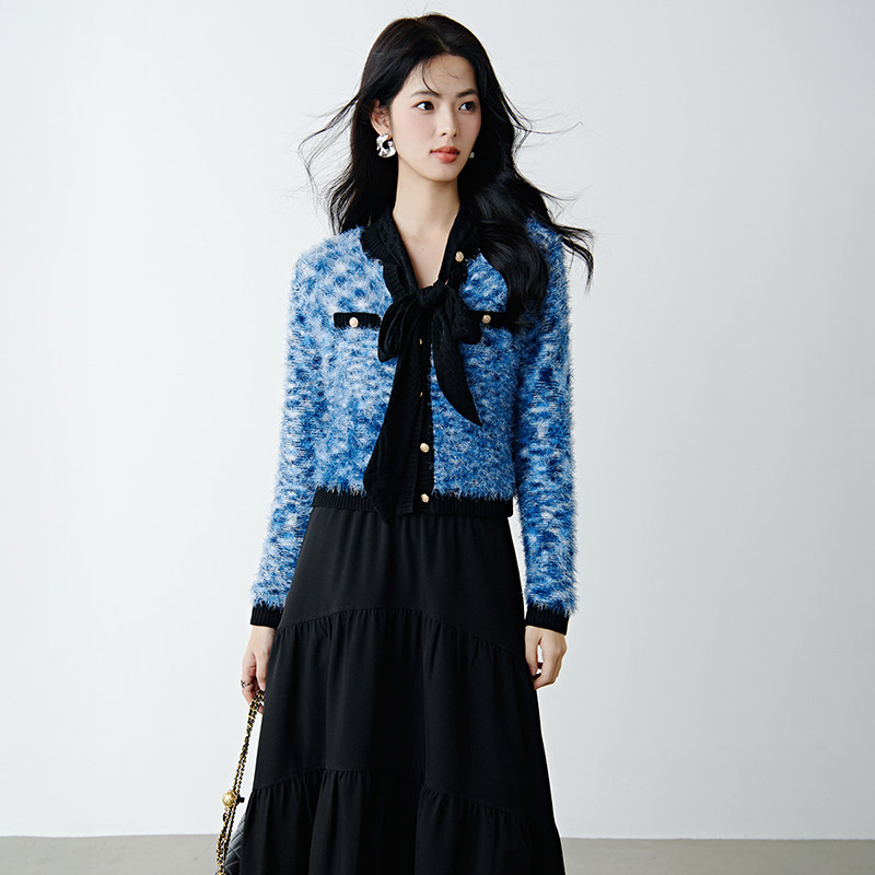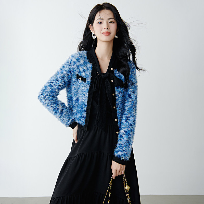 晚白2026年春新款时尚黑金撞色小香风毛衣软糯舒适短针织开衫女