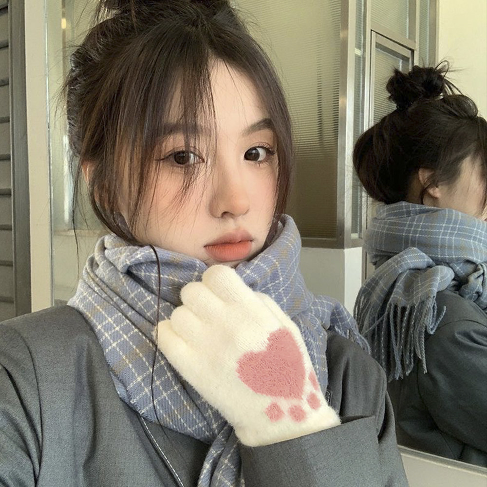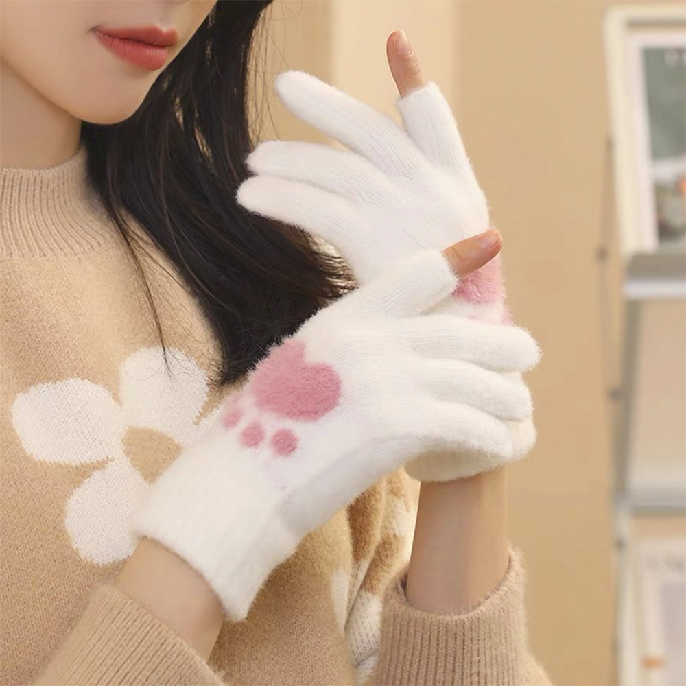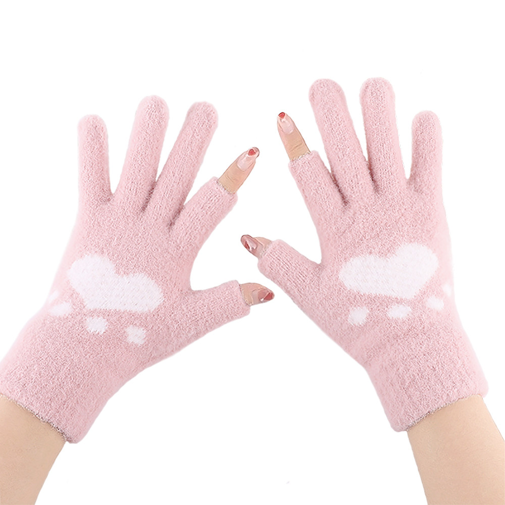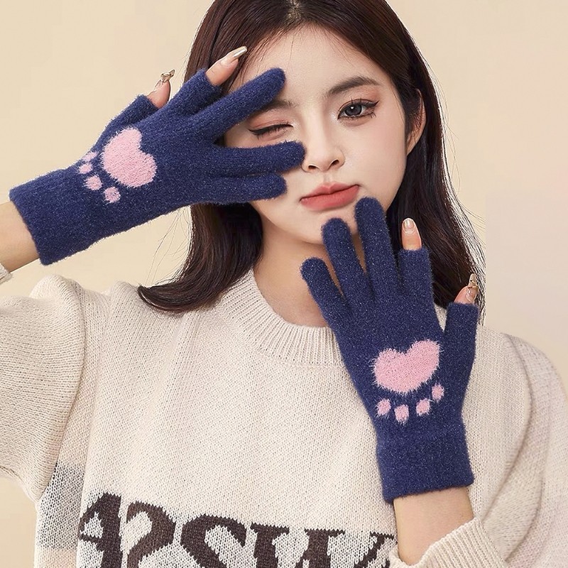 露指保暖毛绒手套女冬季触屏可爱学生加绒厚防寒写字露二指防风