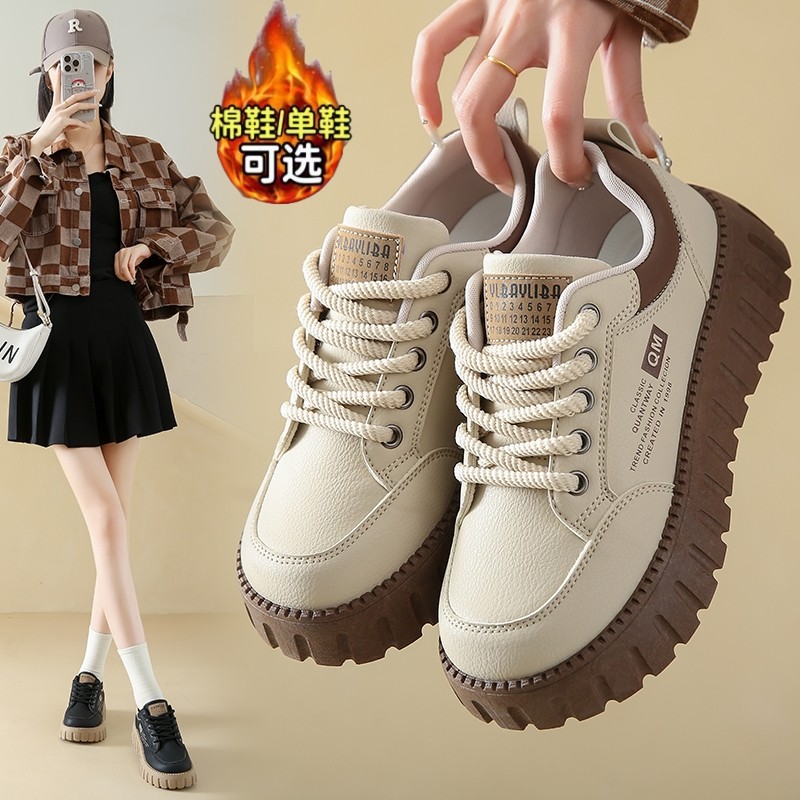 运动鞋厚底休闲板鞋女2025秋冬女款新款米色加绒女鞋内增高德训鞋