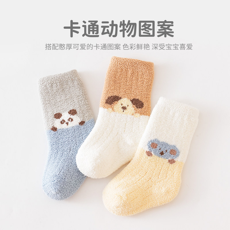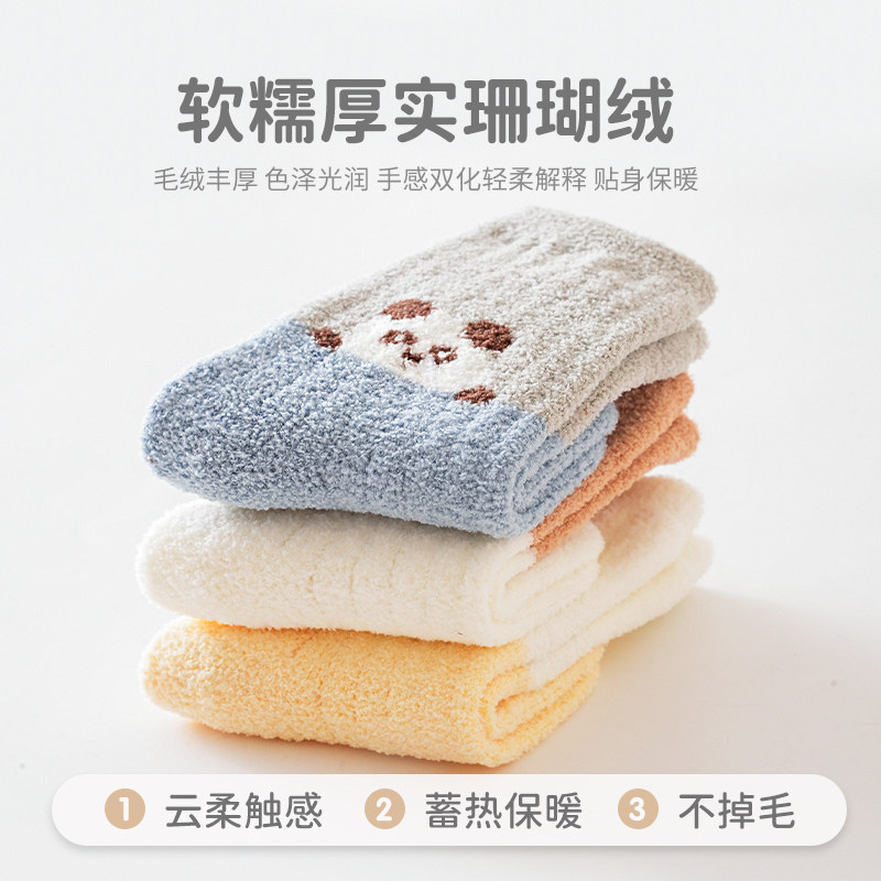 婧麒婴儿袜子宝宝秋冬季加厚保暖珊瑚绒袜子三双装儿童加绒中筒袜