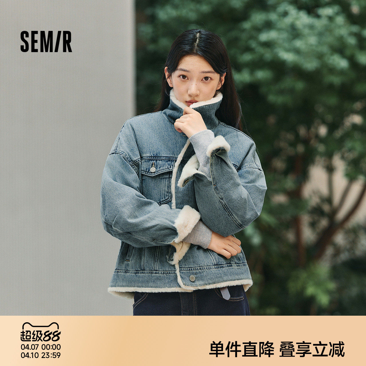 森马牛仔外套女拼接仿兔毛翻领宽松潮流港风冬季落肩夹棉夹克复古