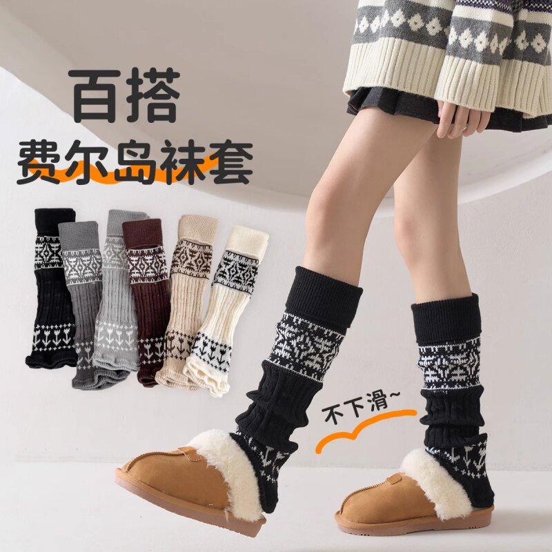 日系复古费尔岛袜套秋冬保暖灰色针织提花堆堆袜子y2k雪地靴腿套