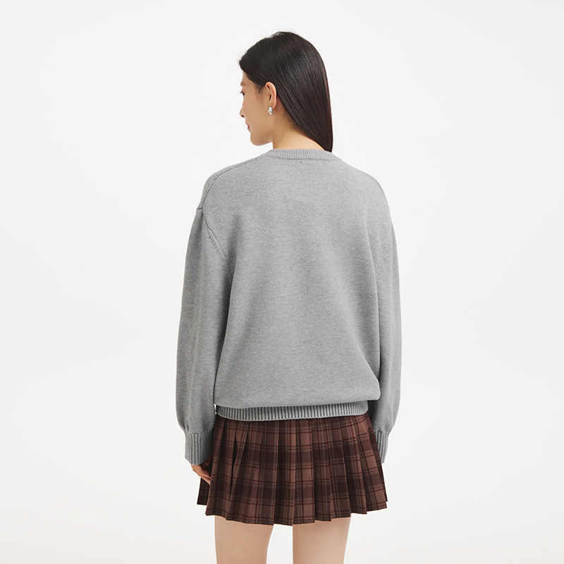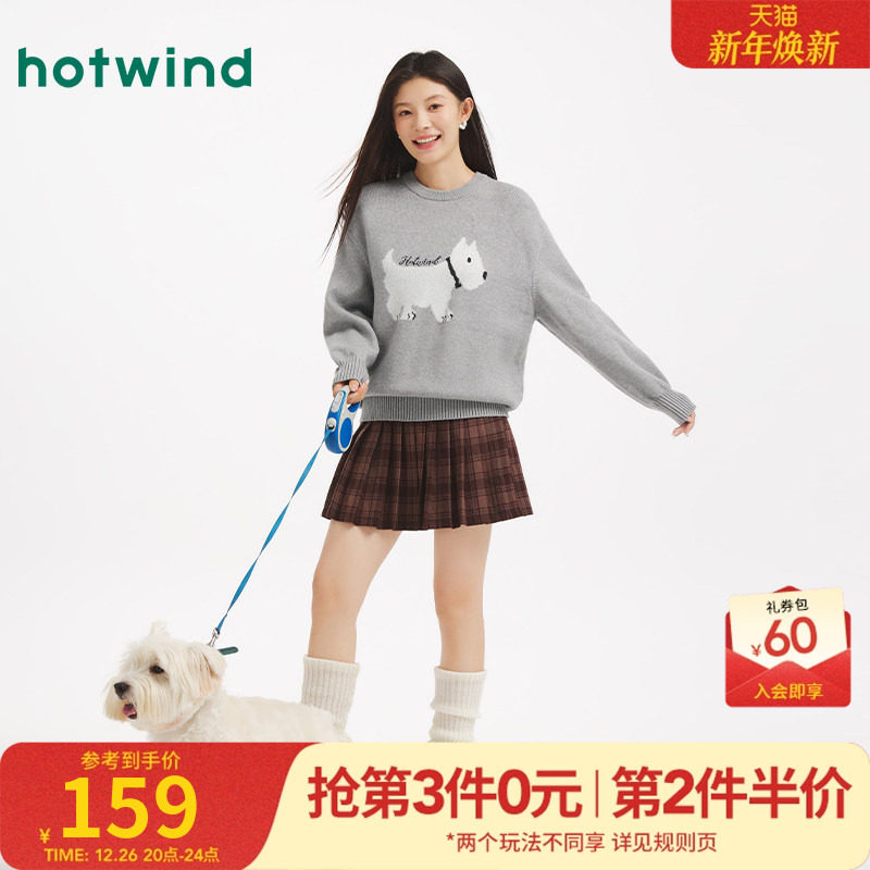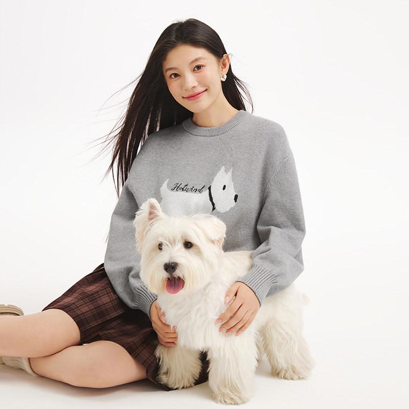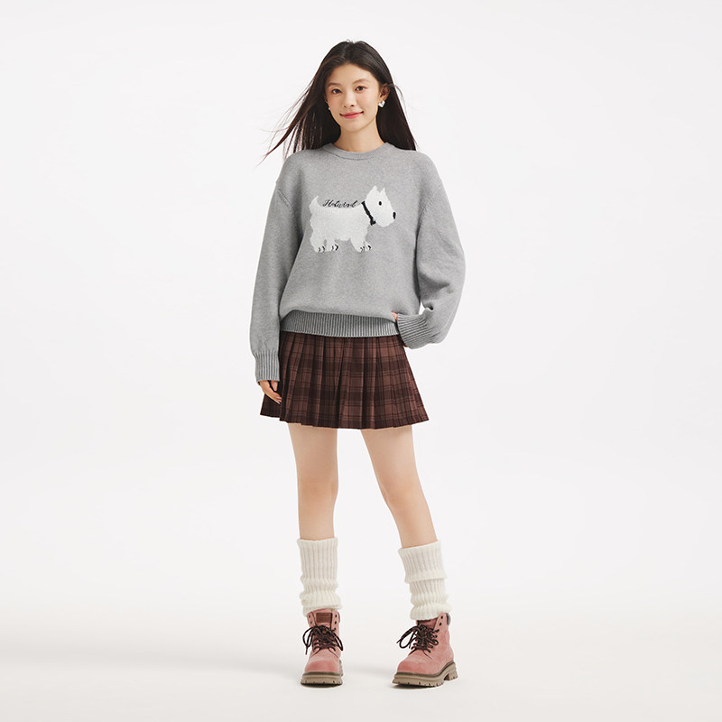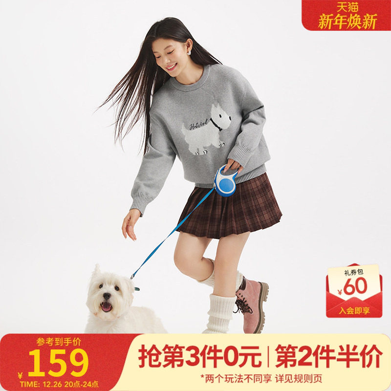 热风2025年冬季新款女士动物小狗圆领针织衫甜美时尚减龄