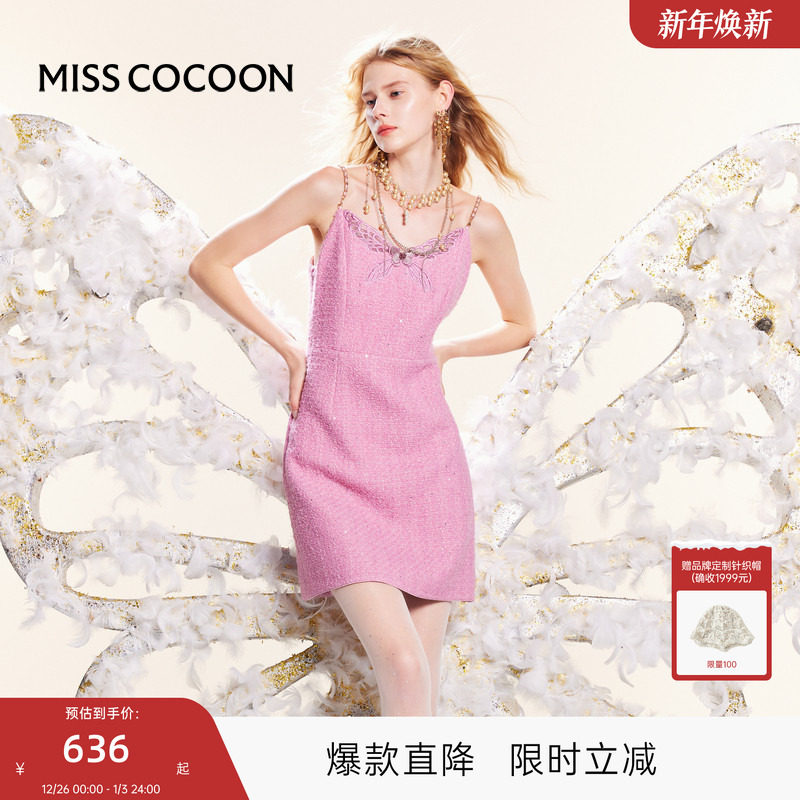 可可尼cocoon小香风吊带连衣裙女2025秋季新款亮片镂空蝴蝶结裙子