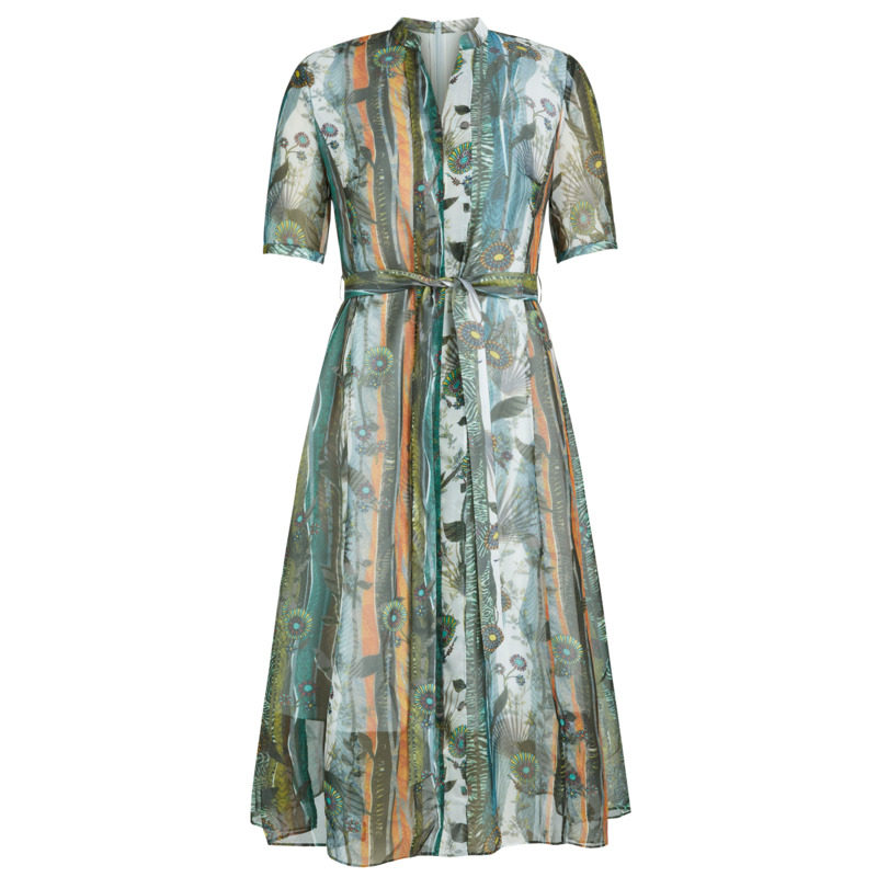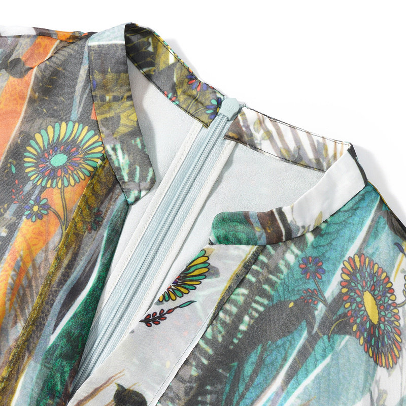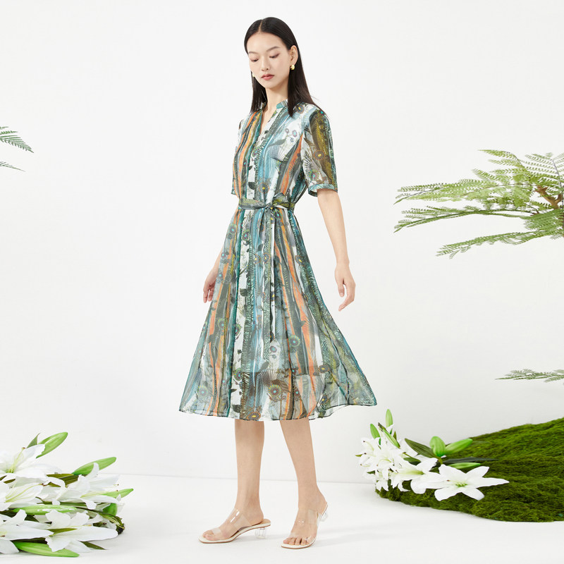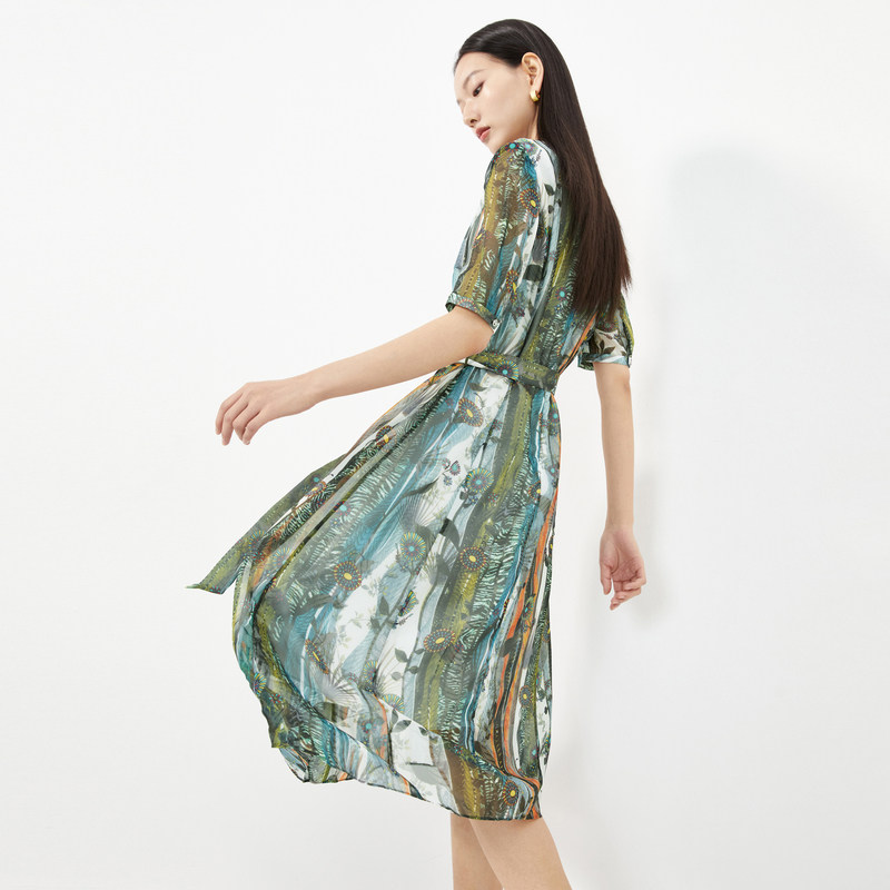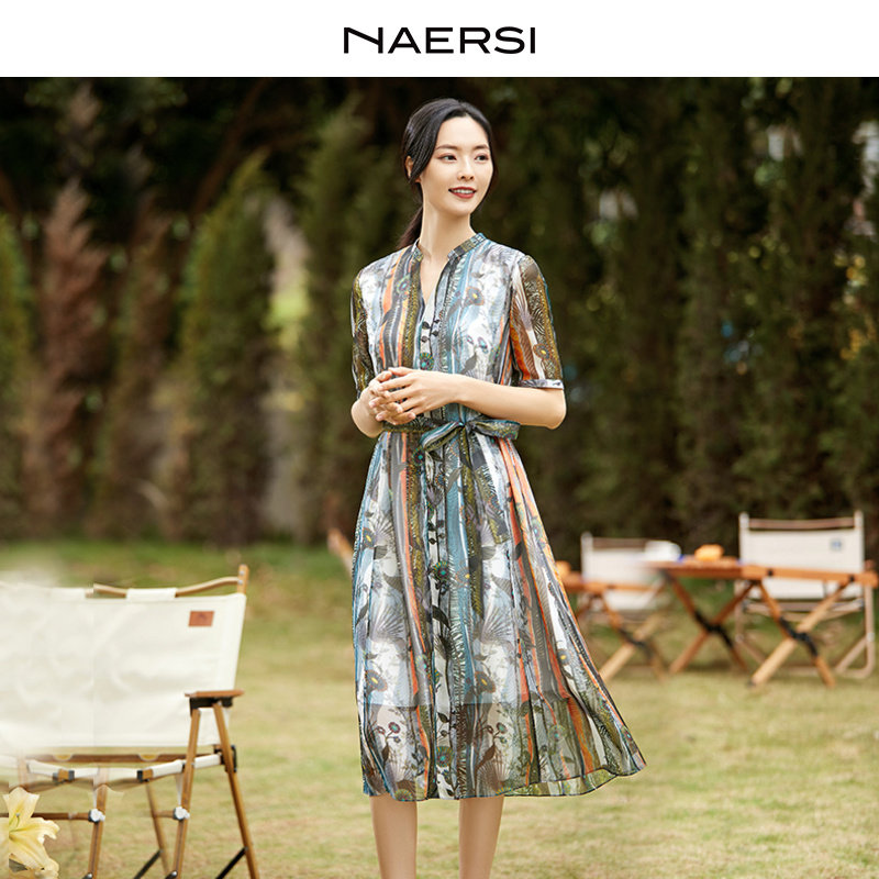 【松弛假日】NAERSI/娜尔思V领雪纺印花连衣裙夏通勤度假风裙子