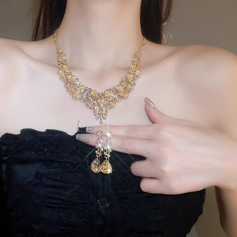 两件套金色闪钻水滴项链女新款脖颈链新娘首饰晚礼服锁骨配饰品