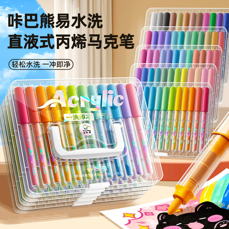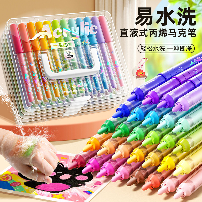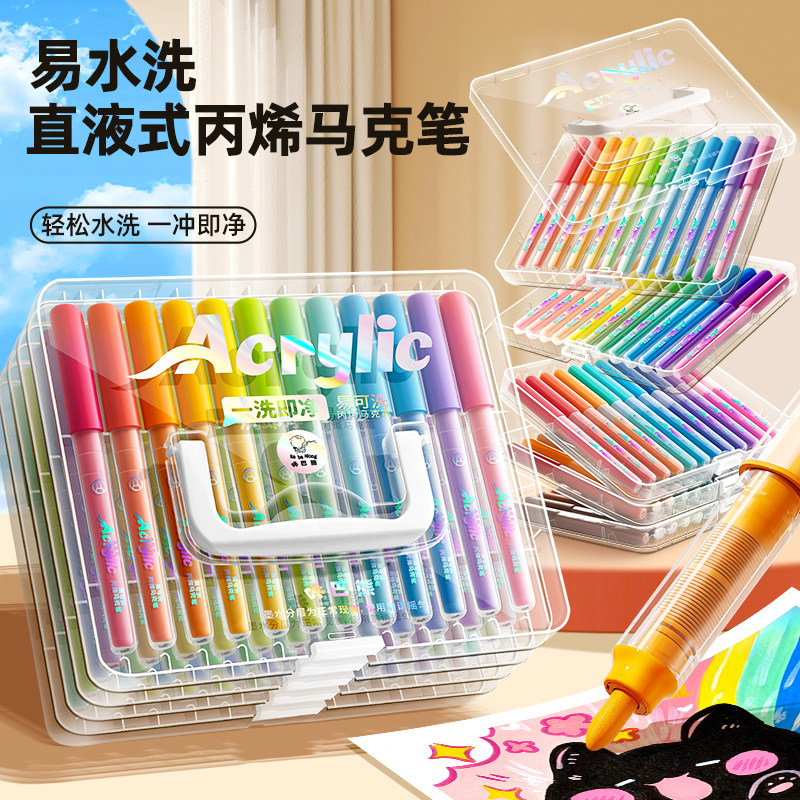 直液式丙烯马克笔软头小学生美术专用水彩笔儿童颜色笔可水洗24色画笔不透色48绘画可叠色彩色笔36水性丙烯笔