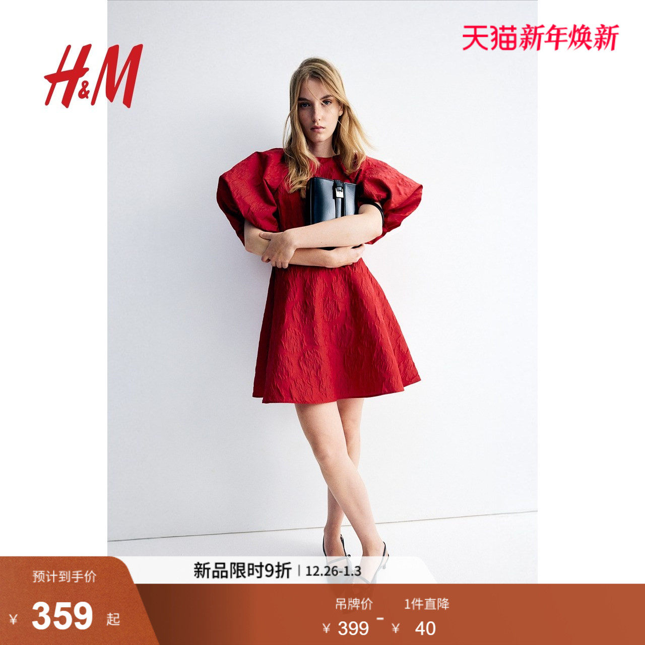 HM女装红色连衣裙冬季背面系带冬季节提花蝴蝶结长裙1247667