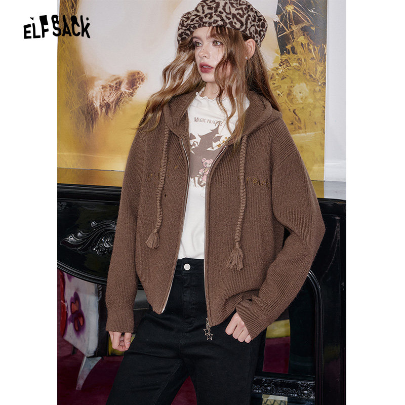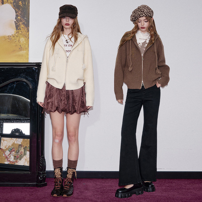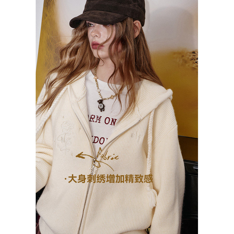 妖精的口袋字母刺绣绵羊毛新年毛衣女2025秋冬新款学院风连帽外套