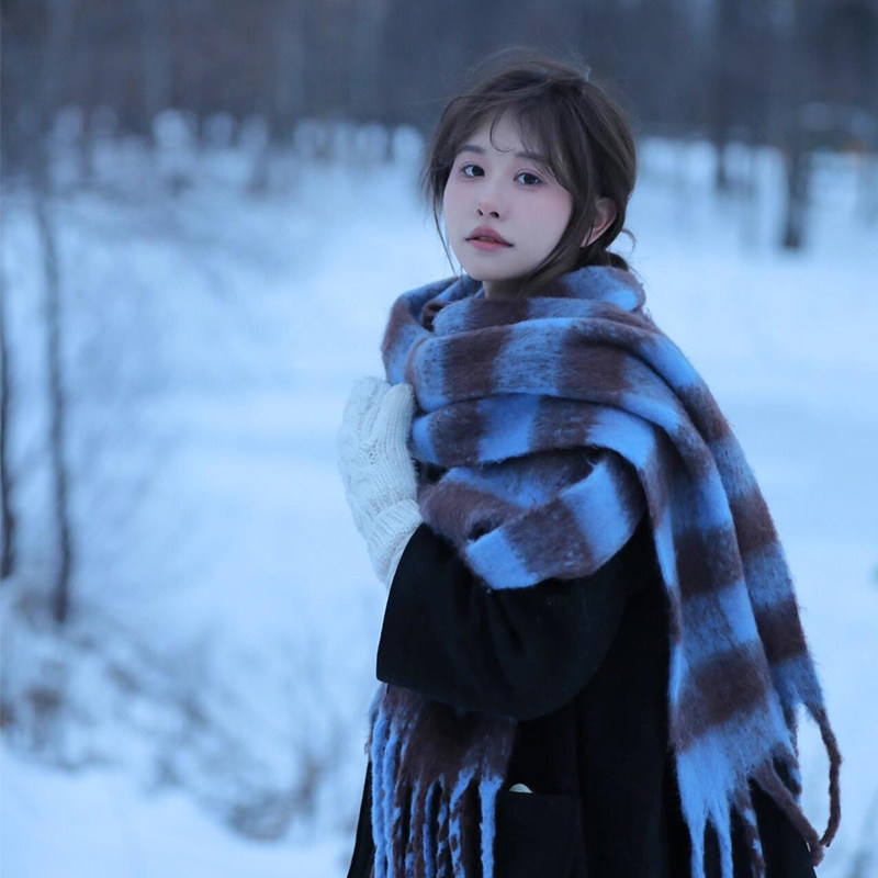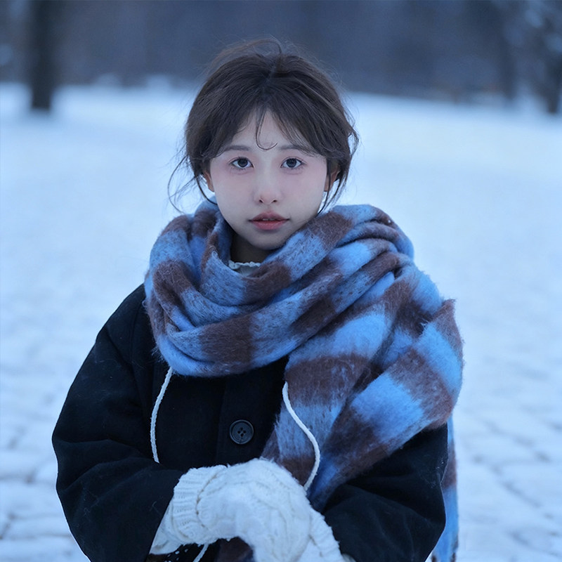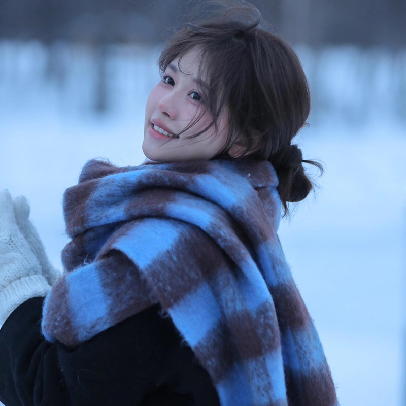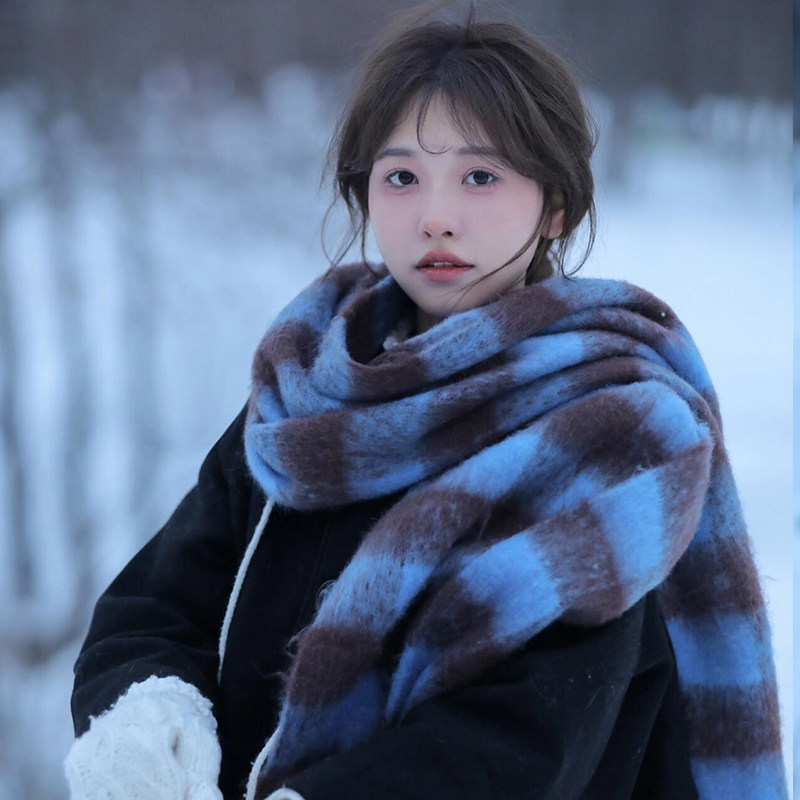 虞书欣同款围巾女冬季韩版情侣男加厚保暖马海毛围脖蓝色格子披肩