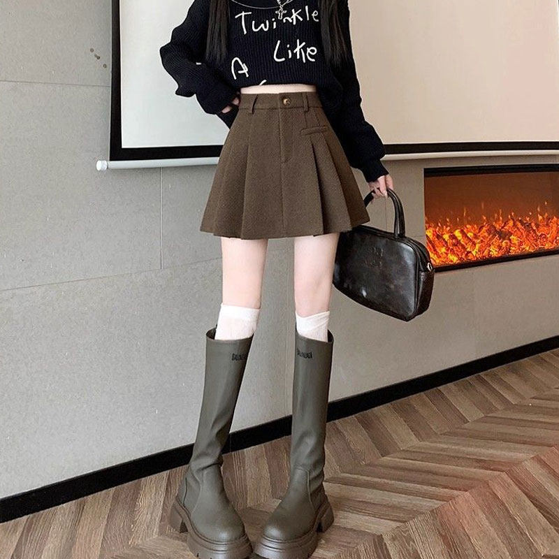 时尚INS风秋冬港风毛呢A字短裙高腰遮胯小个子百褶裙大码半身裙子