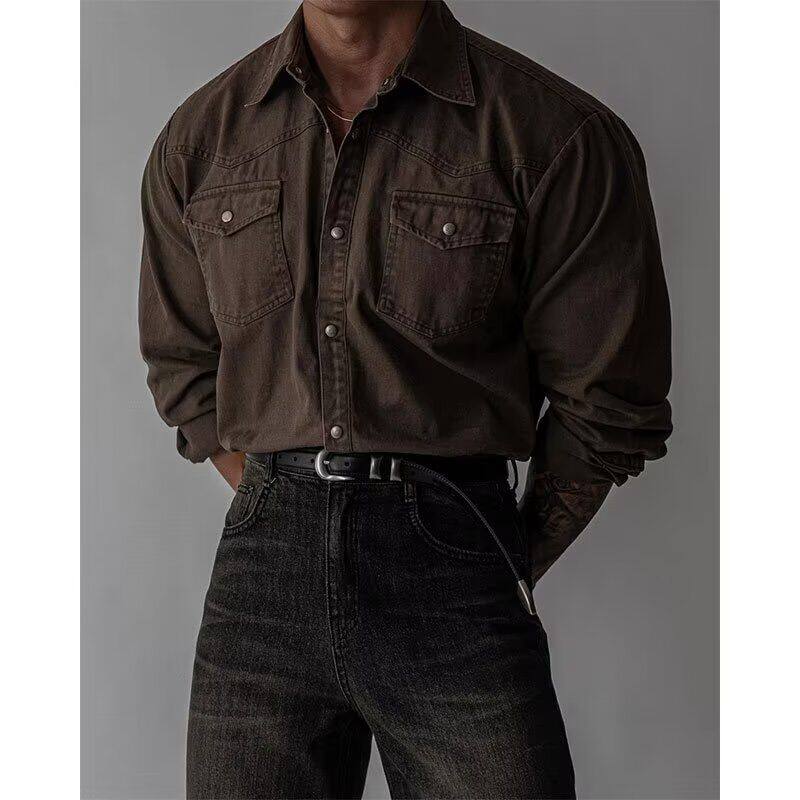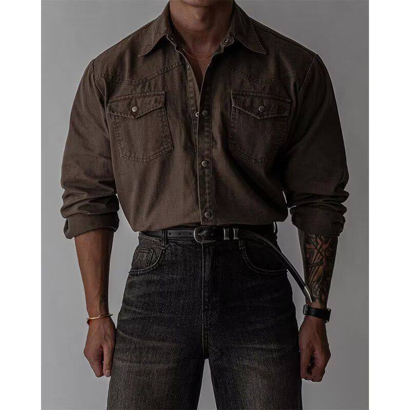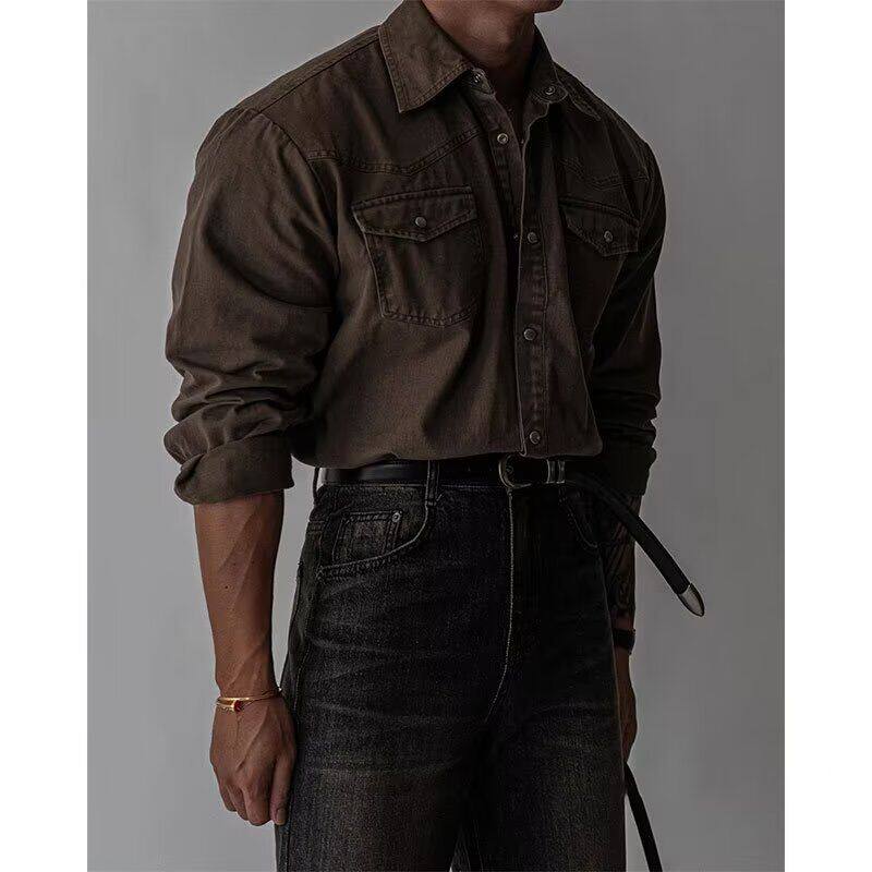 老钱风纯色工装长袖衬衫男纯棉新款宽松韩系通勤做旧衬衣外套潮牌