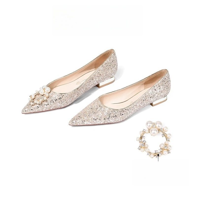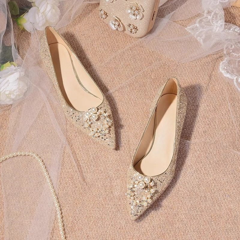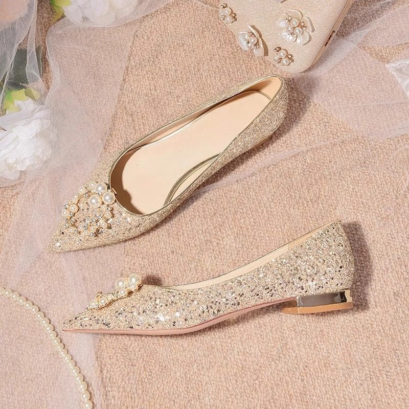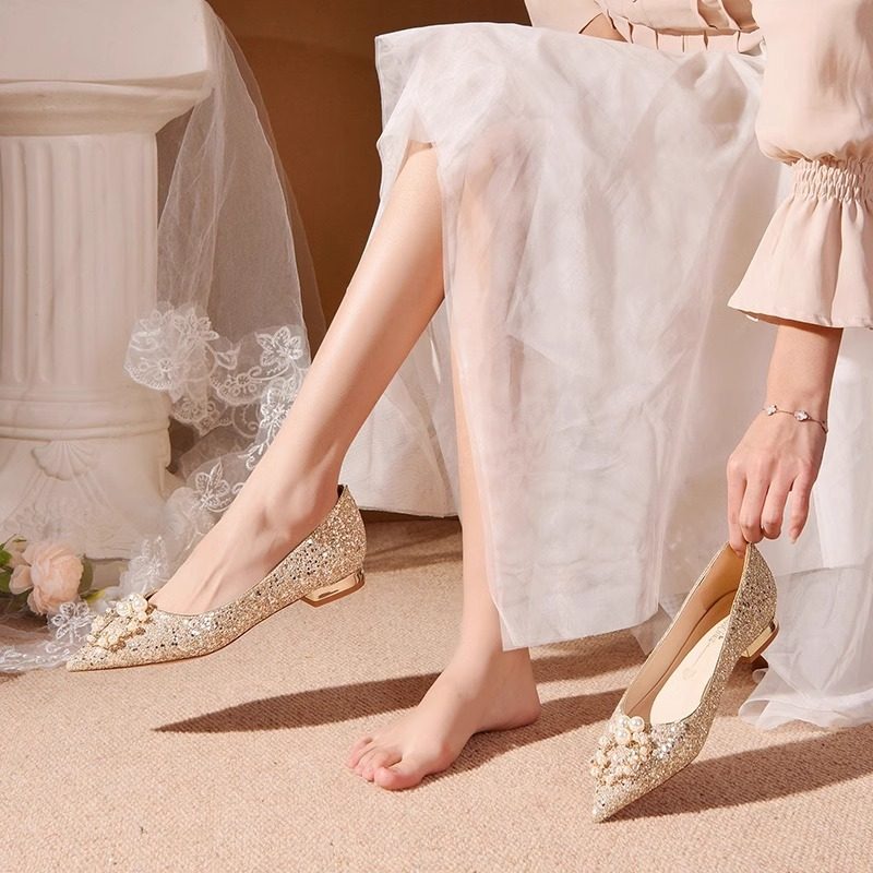 法式结婚鞋女2024新款秀禾主婚纱两穿孕妇平底新娘鞋水晶鞋不累脚