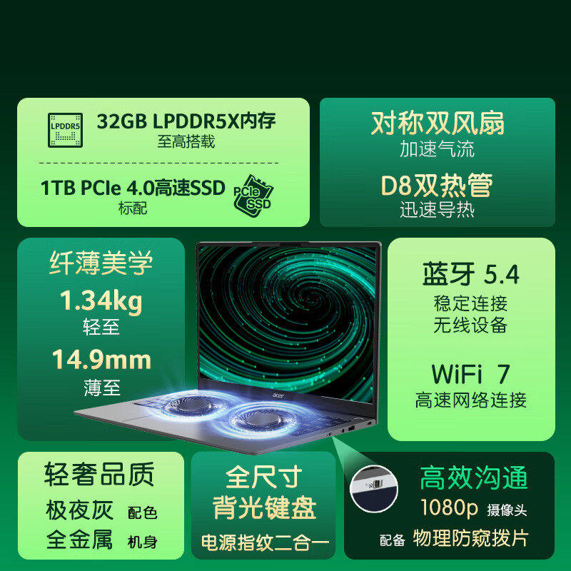 Acer/宏碁 非凡Go pro AI 高通 骁龙X Elite处理器 14英寸2.5K屏120Hz刷新率超轻薄 商务办公笔记本电脑