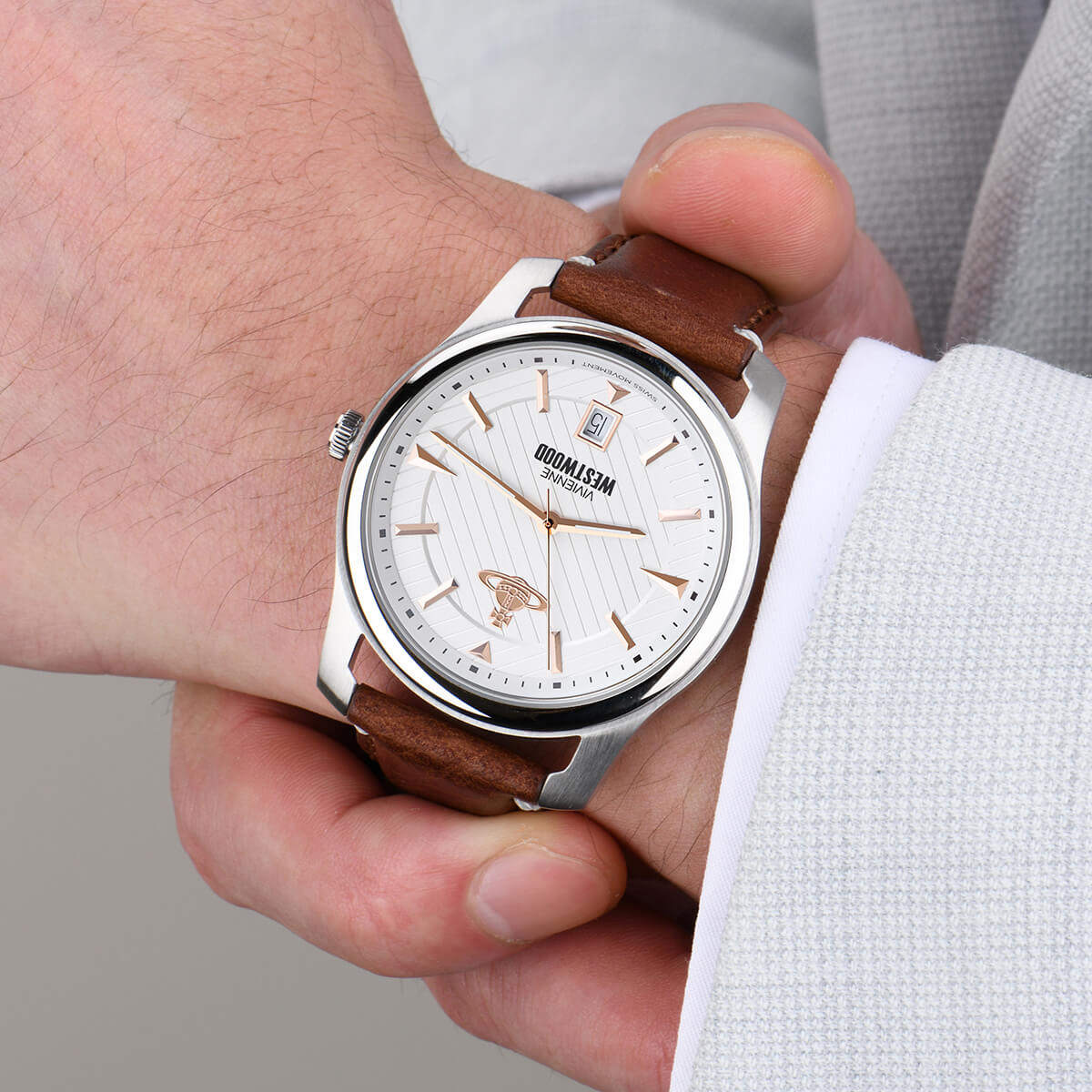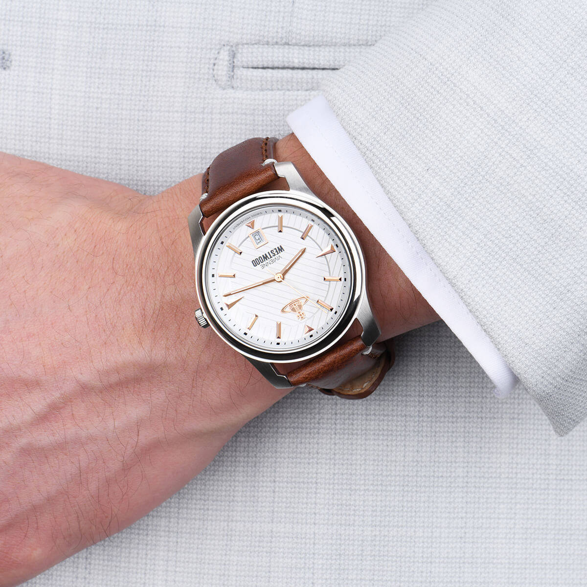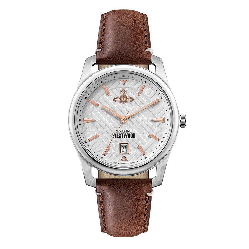 西太后男表薇薇安棕色腕表男士手表日历真皮手表