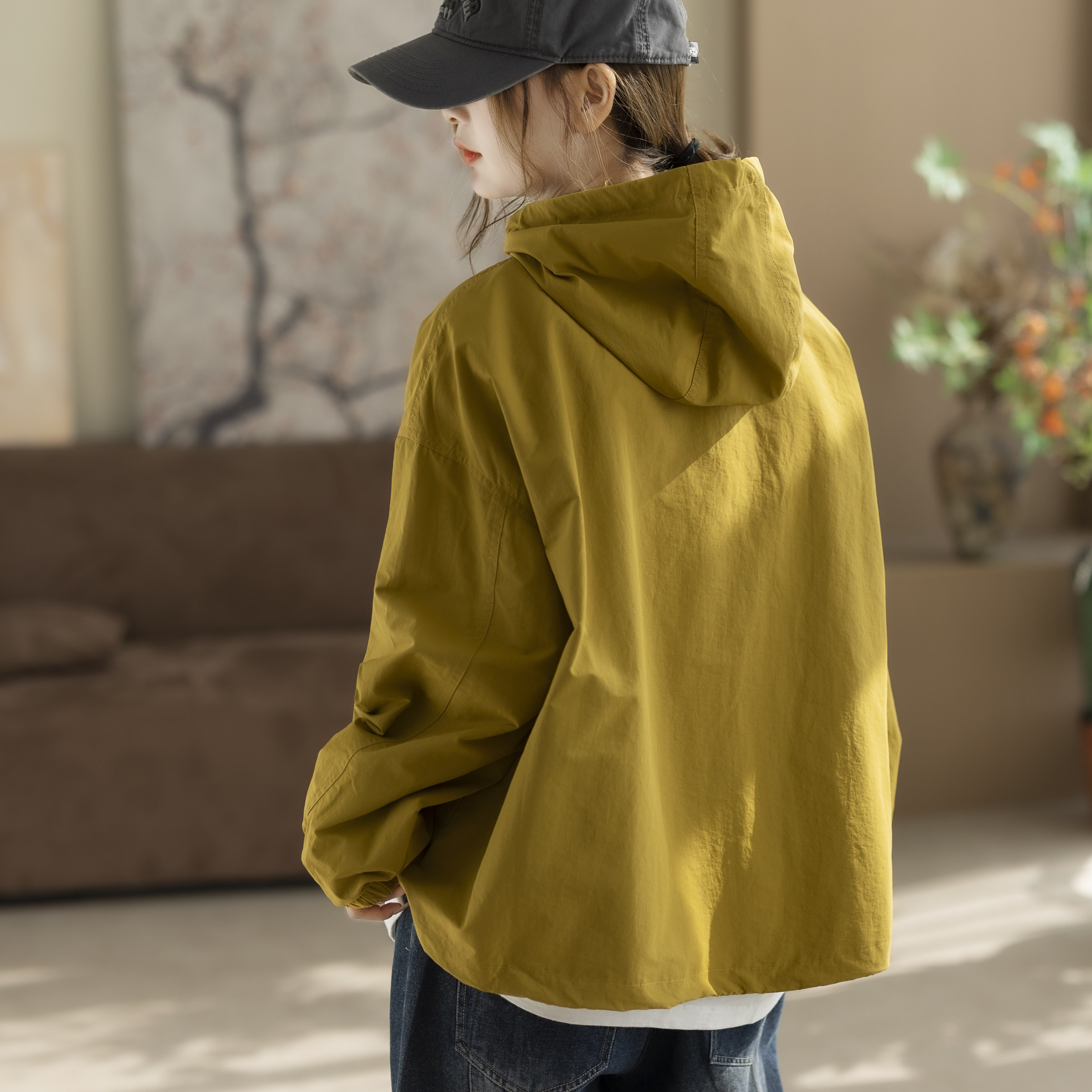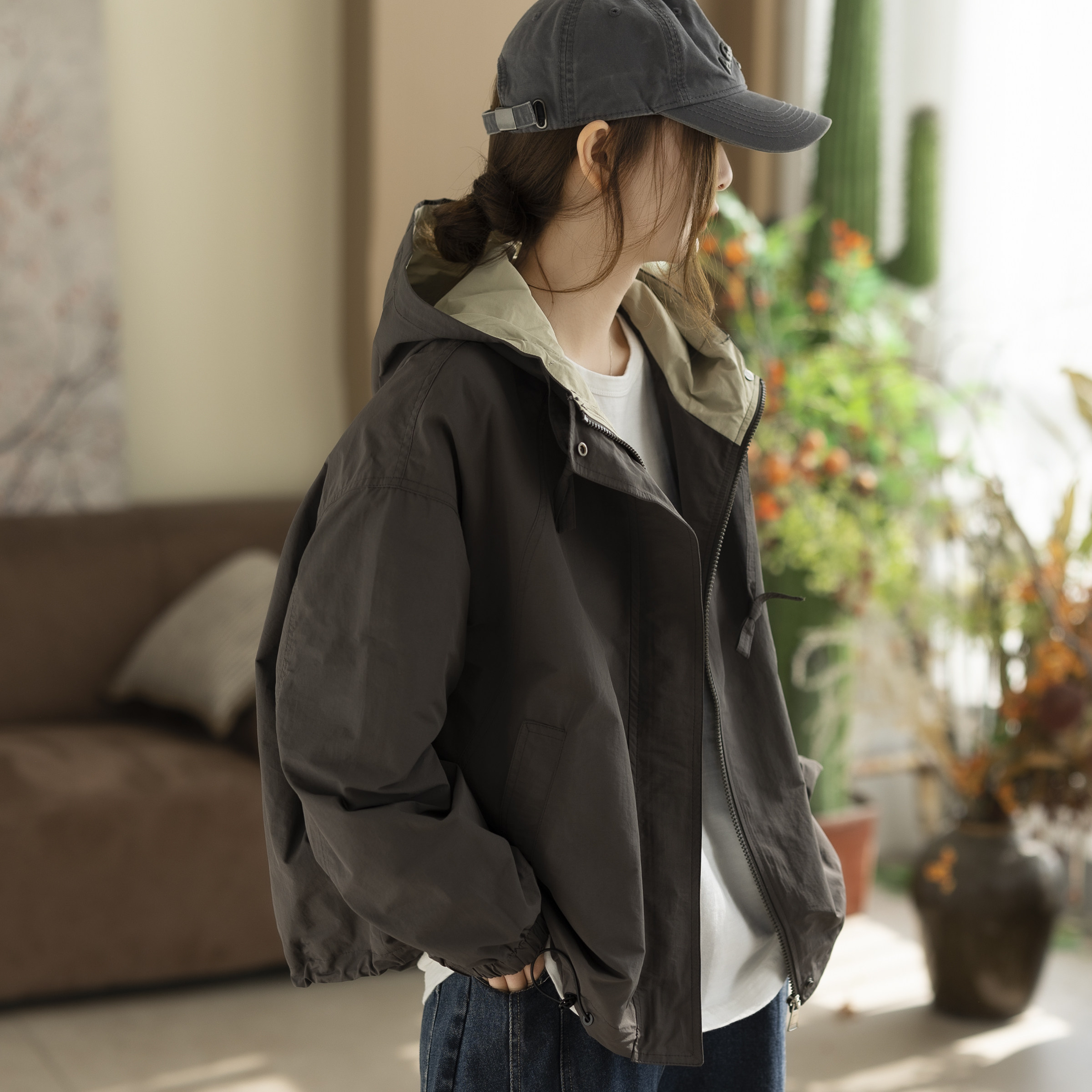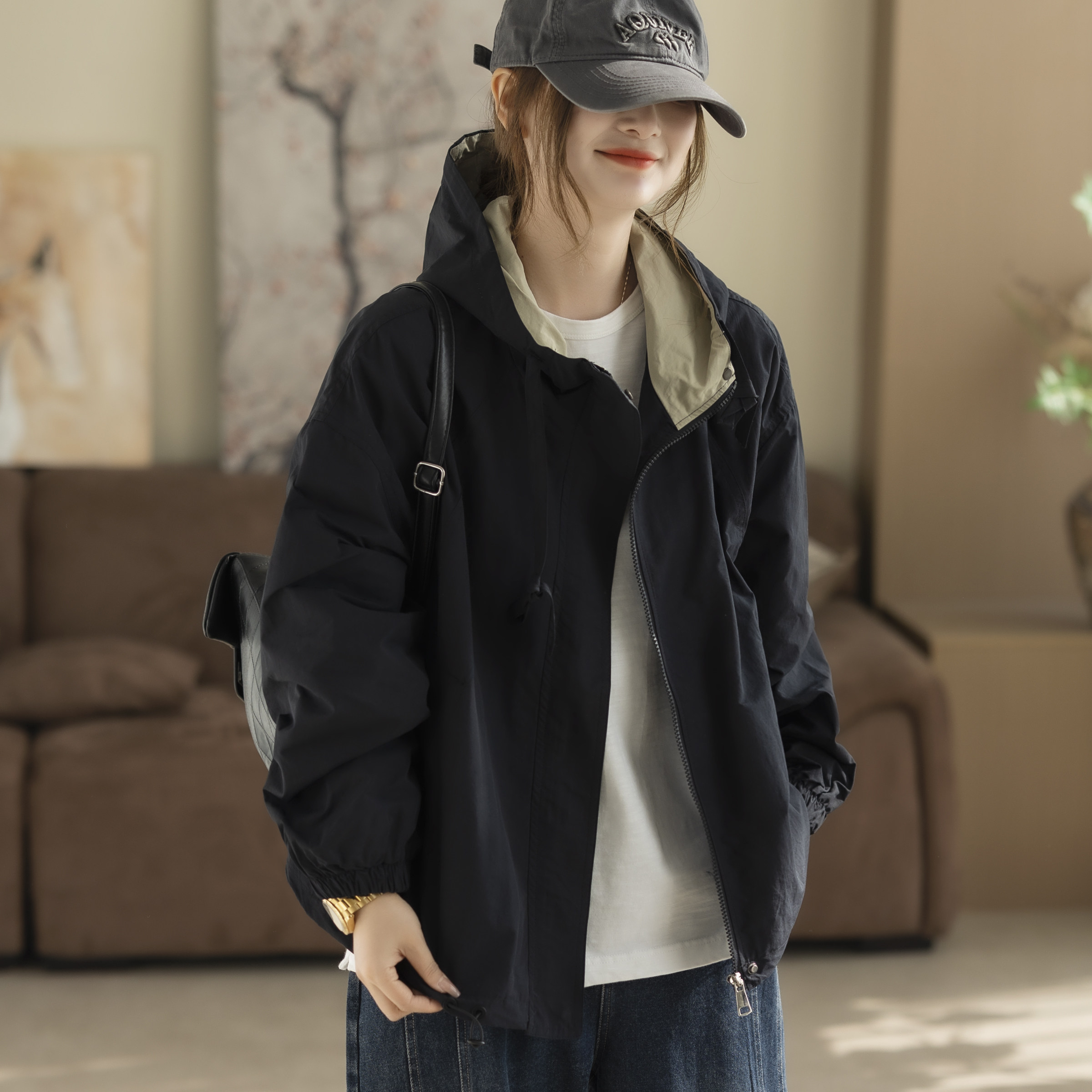 咖咪羽拼色连帽冲锋衣外套春秋韩版宽松休闲减龄短款上衣