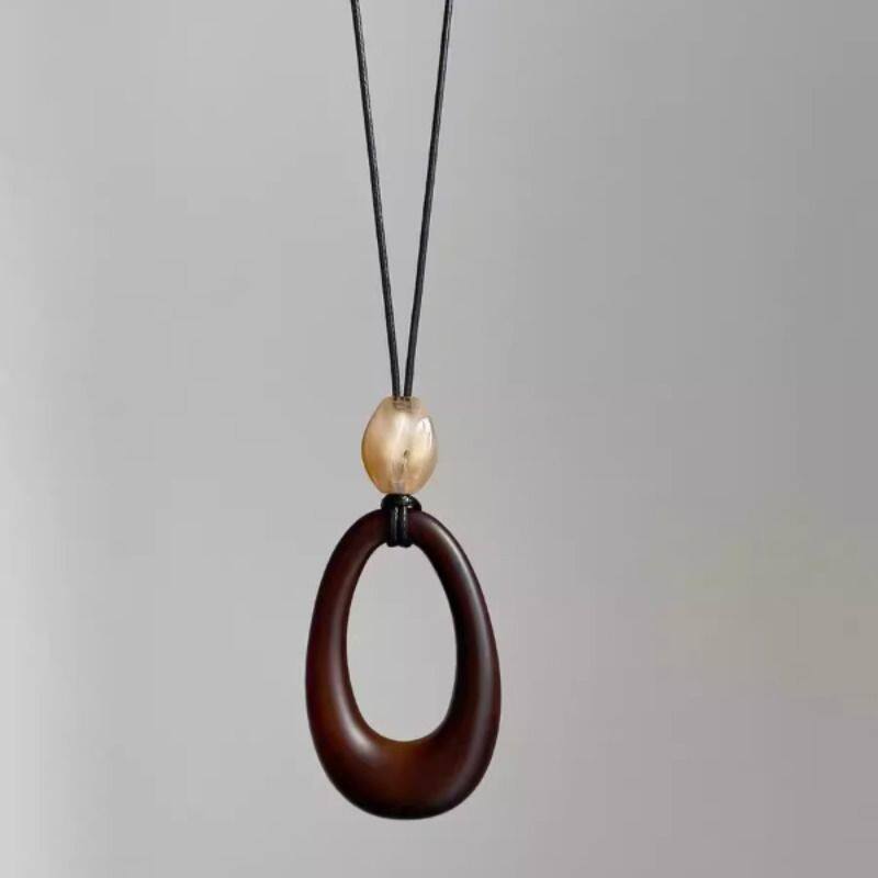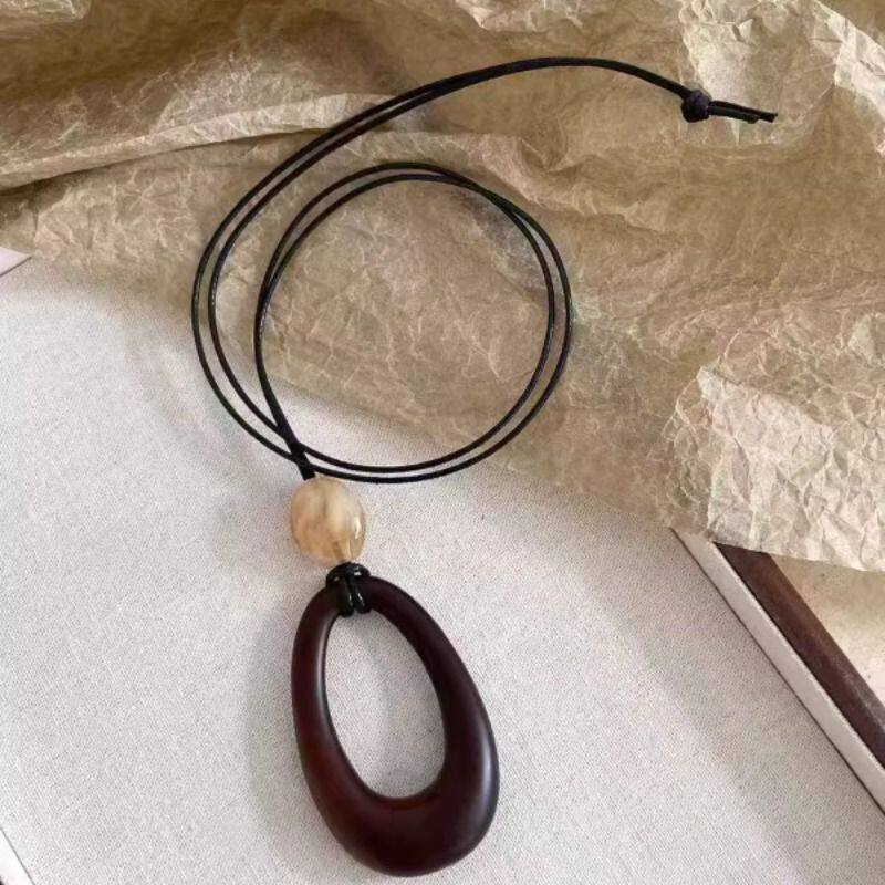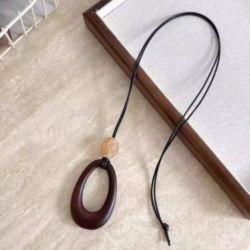 原宿风~黑皮绳镂空椭圆吊坠项链女2025新款小众设计民族风毛衣链