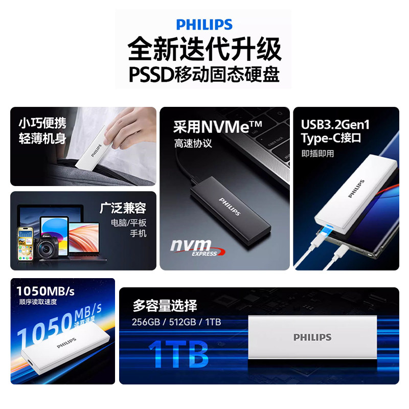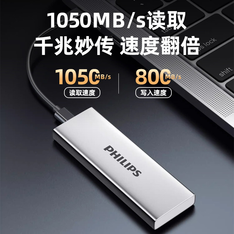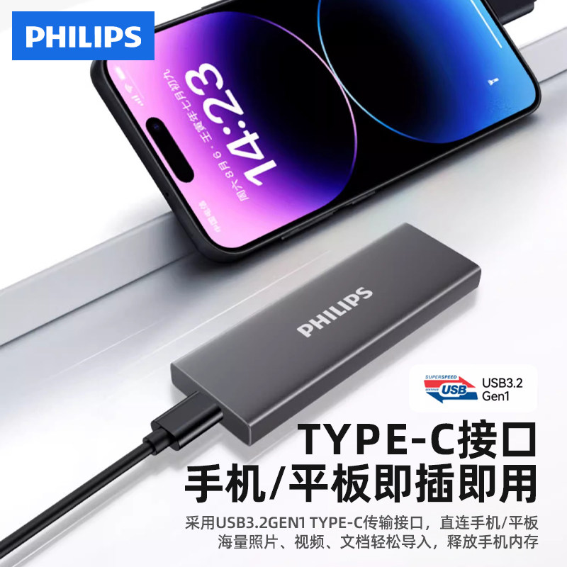 飞利浦移动固态硬盘1t大容量高速2t手机电脑两用相机外接存储SSD